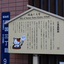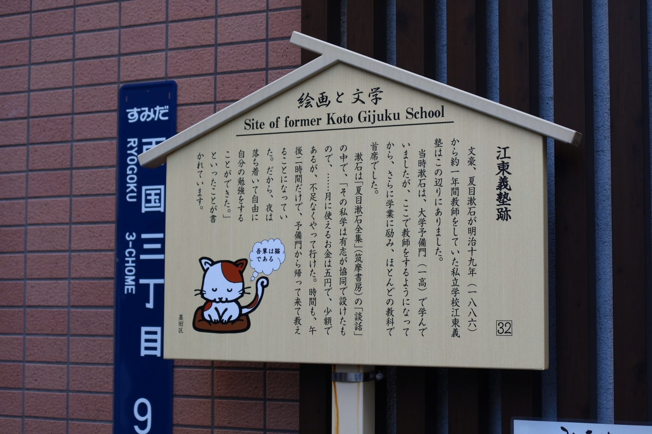 両国本所の吉良邸裏門のあった場所から1ブロック下がった「みきや」と言うお店の脇に江東義塾跡の立て札があります。夏目漱石が一高に在学中の明治19年から約1年間教師をしていた私立学校江東義塾がこの辺りにあったとのこと、夏目漱石がこんな所でバイト?をしていたとは知らず驚きました。