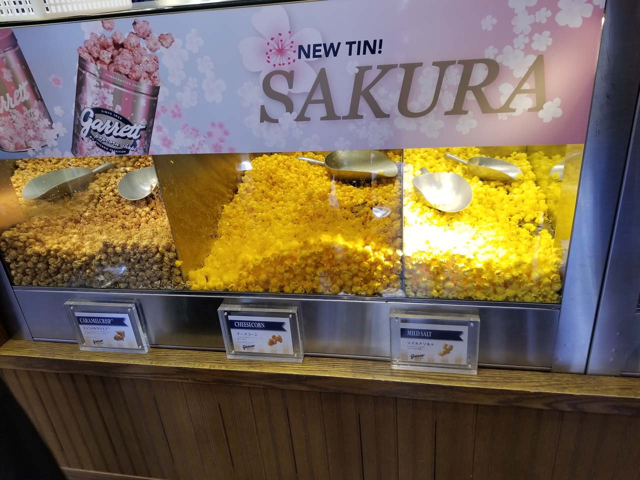 大人気のギャレットポップコーンが、アウトレットにありました。季節限定のイチゴフレーバーと、定番のポップコーンが数種類あり、好きな量、種類を買うことがてきます。かわいい缶入りが人気です。全種類味見をしたいときは、袋入りで、400円くらいから買えます。キャラメルフレーバーのポップコーンが美味しかったです。
