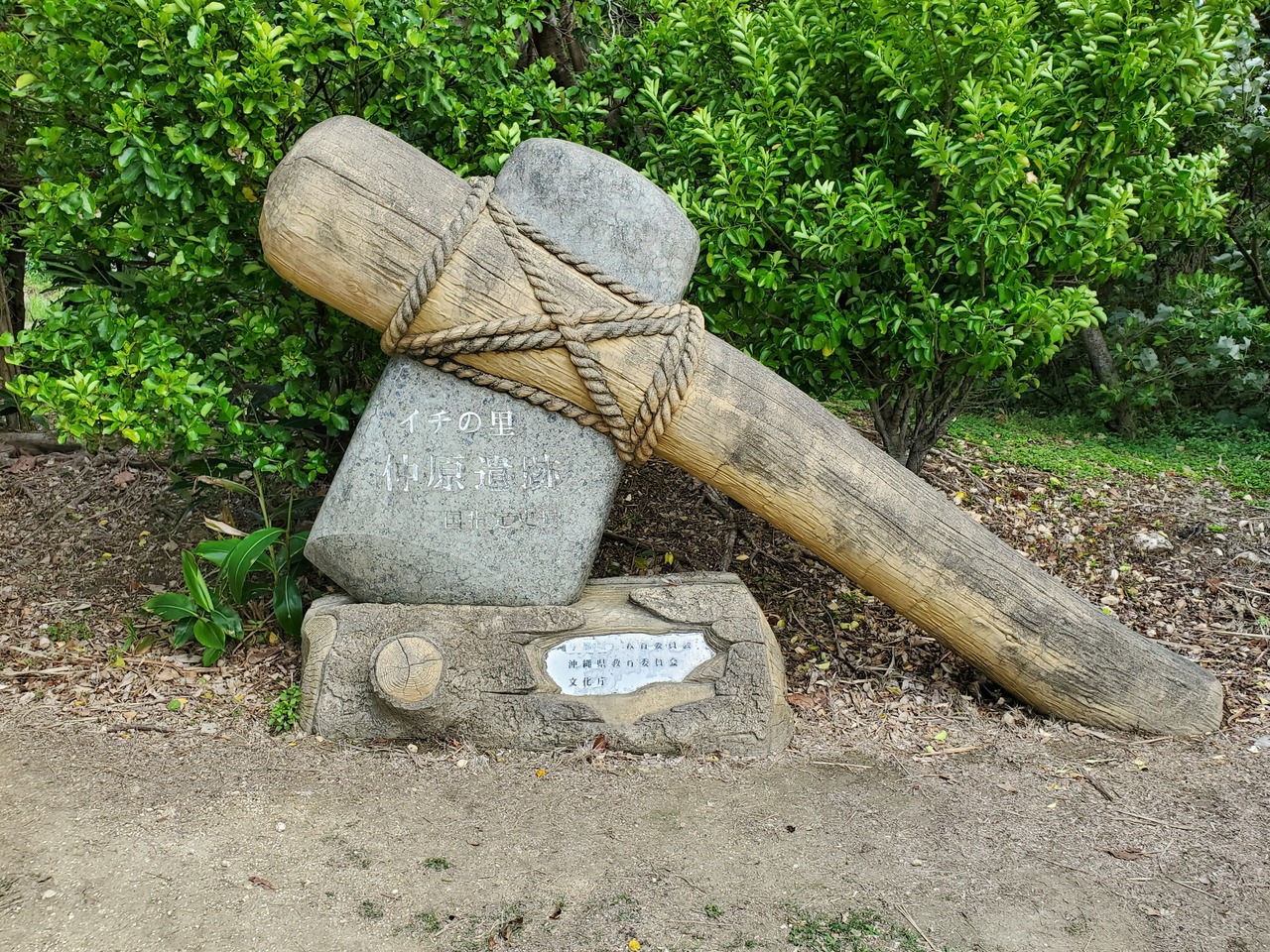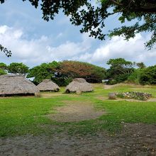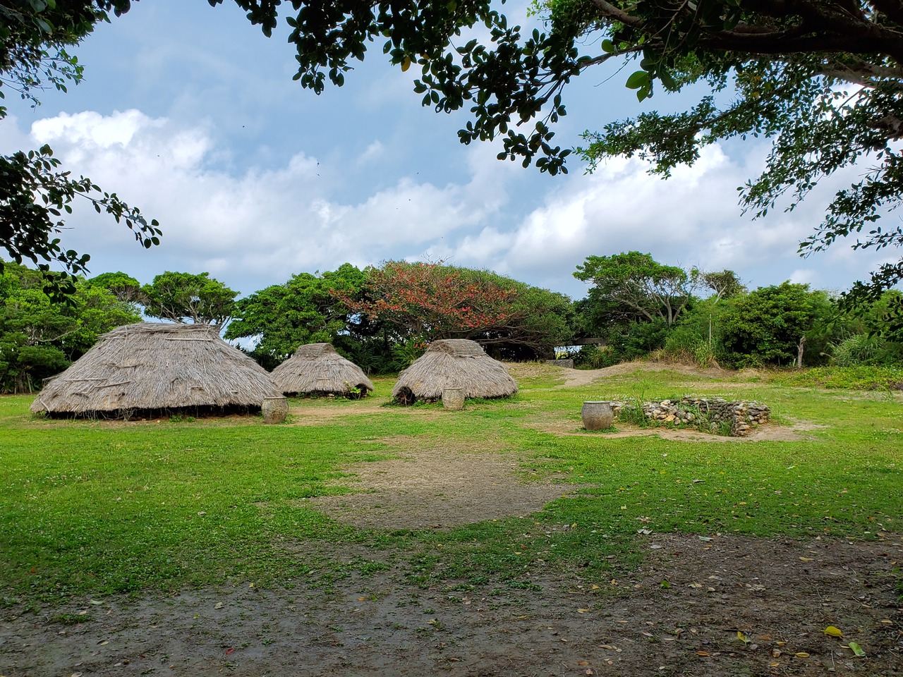 伊計島のど真ん中に遺跡はあります。畑の真ん中にこんもりした防風林の中にあります。住居は、全部で5つ。茅葺きが3つです。元々の遺構に50センチ嵩上げをしたとかかれていました。昭和61年に国指定の遺跡になっていました。