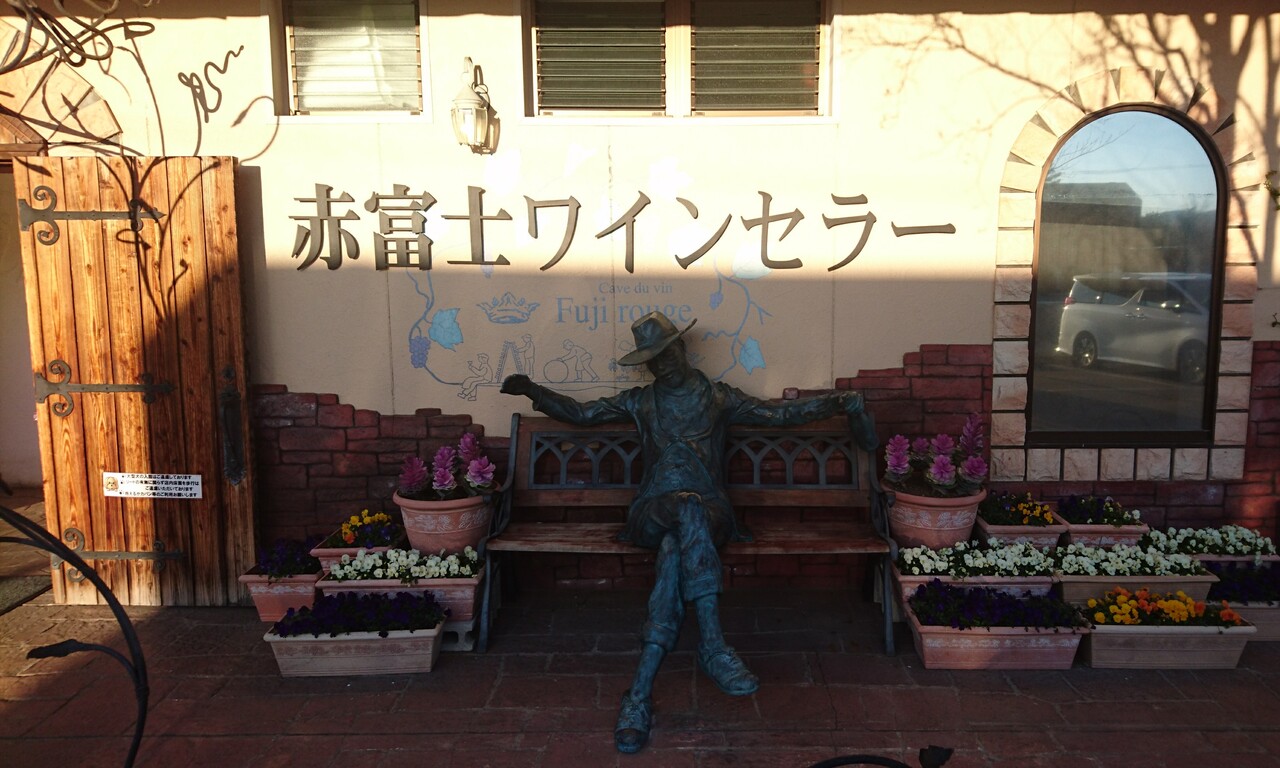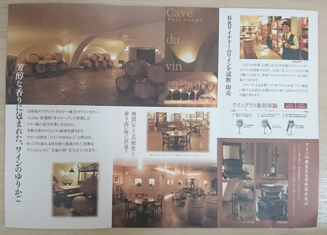 河口湖大橋から車で5分程の所にある長細い建物のワインセラー。入館、試飲無料。入口の隣に写真スポットあり。入るとまずワインの樽とワイングラスに彫刻体験が出来るテーブルあり。その奥の扉を入ると数々のワインのが並べてあり購入も出来る。更に奥にはテーブルと椅子がありゆったりとワインをたしなめる。