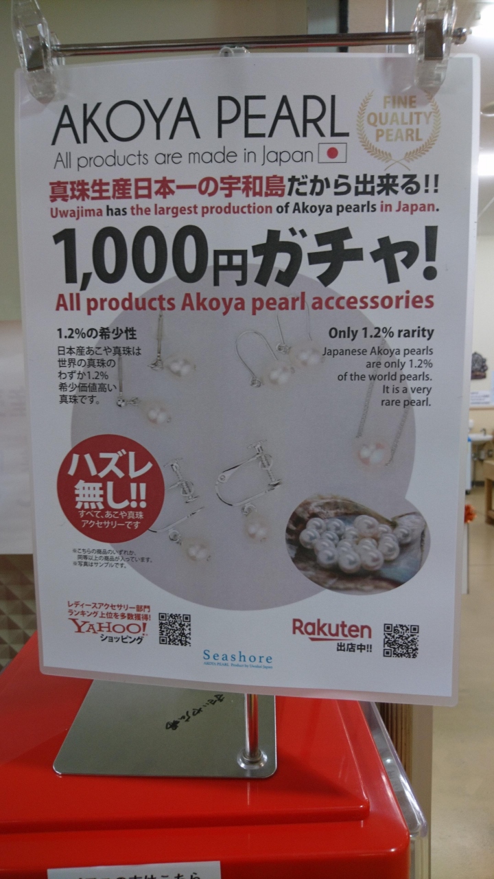 JR宇和島駅から、ゆっくり歩いて15分くらいの所にある道の駅です。なぜか、愛媛は道の駅が多いような気がしますが、気のせいでしょうか?たくさん道の駅は、ありますがどれも個性的なものがあります。ここの道の駅で見つけた驚きのものは、真珠のガチャポン。1つ1000円しますが、得なのでしょうか?わかりませんね。もちろんご当地グルメもふんだんにあり、食べ歩きというより食べてばかりの旅行にいなっています。