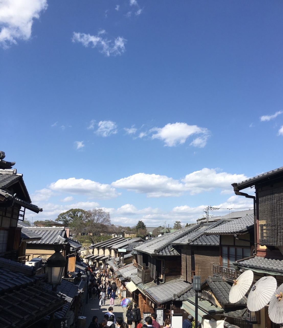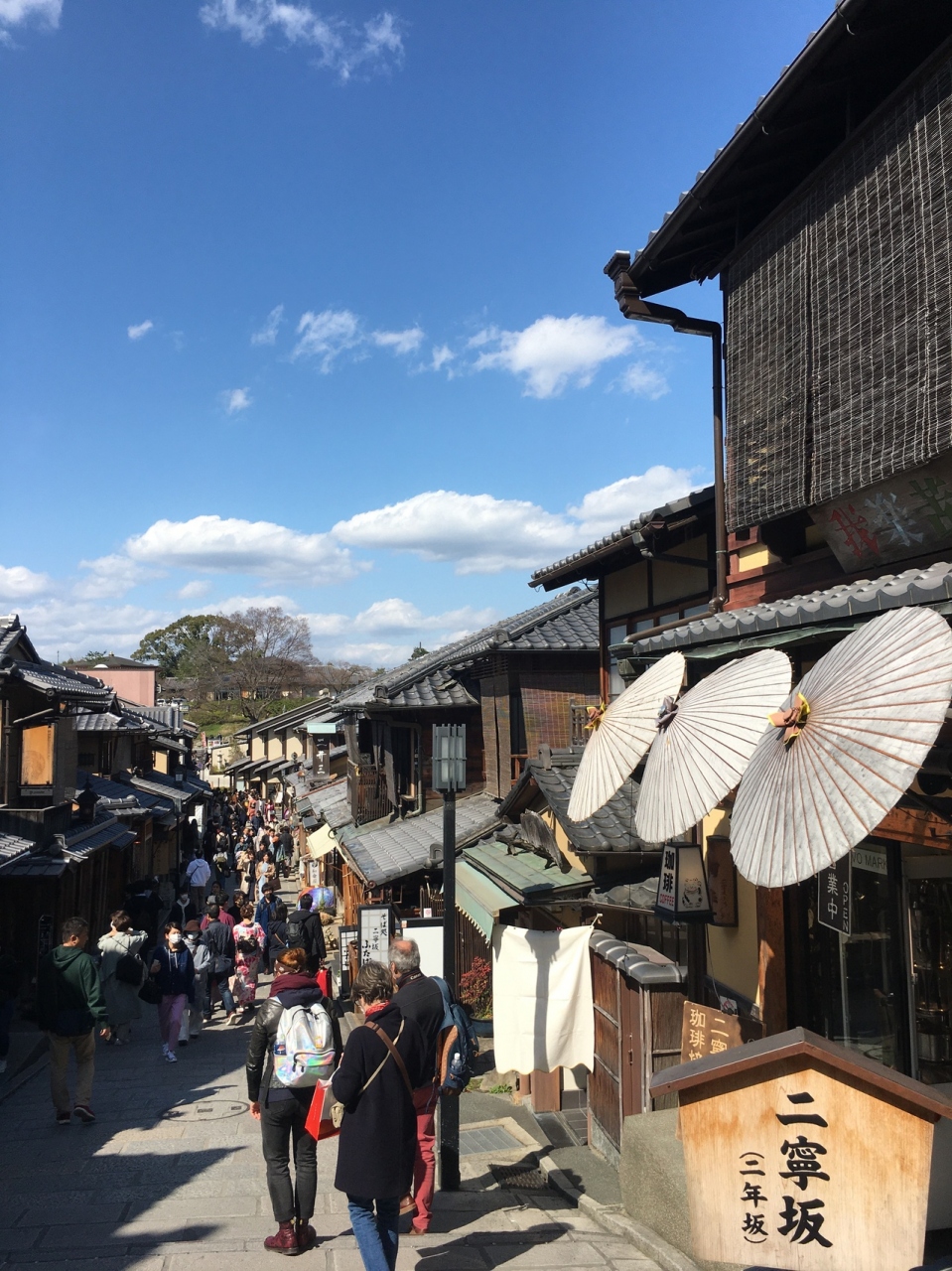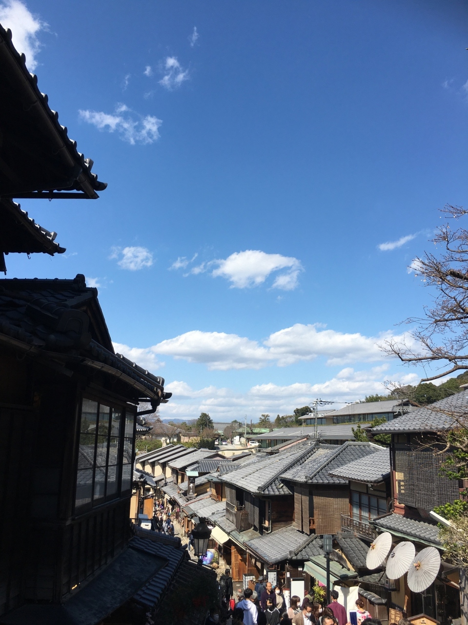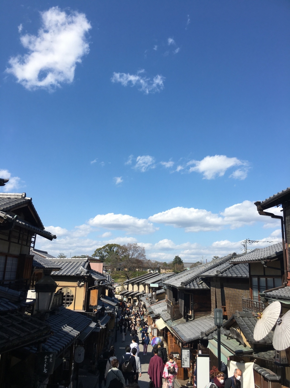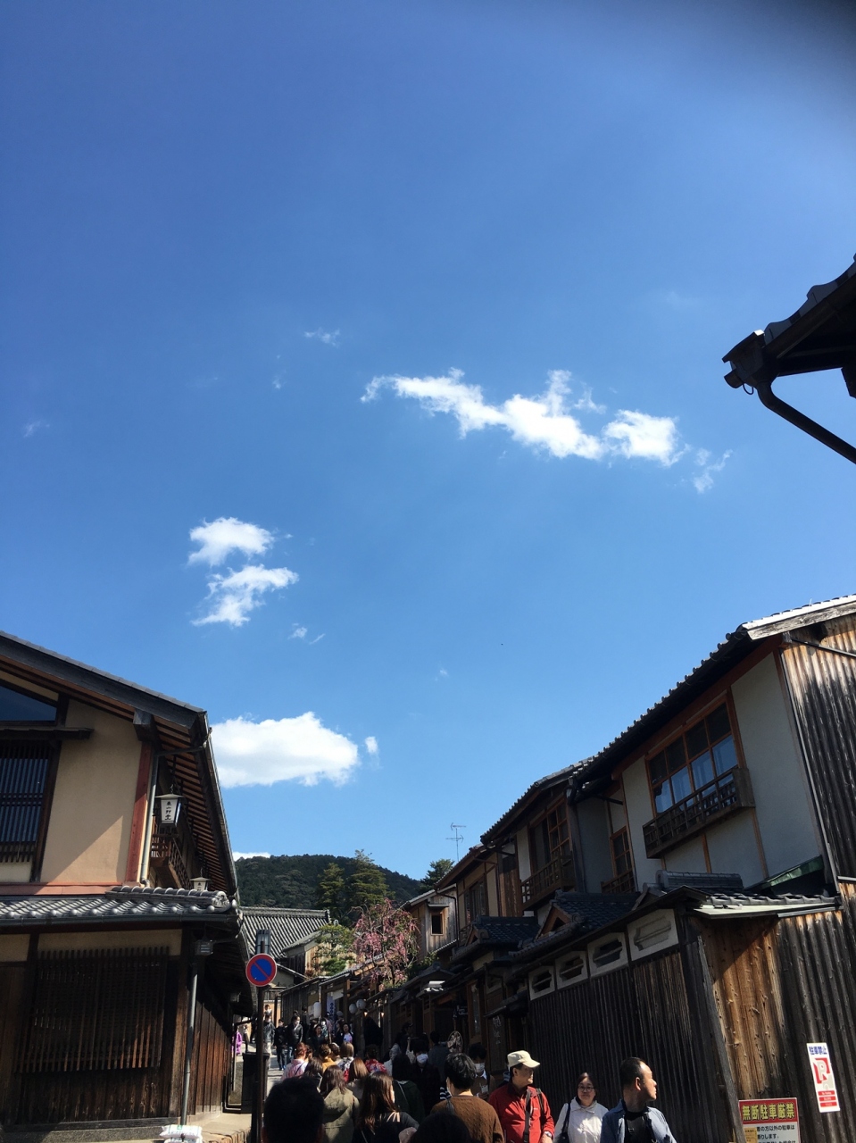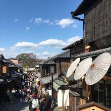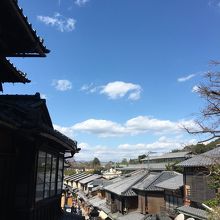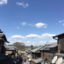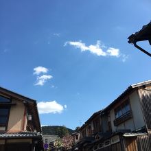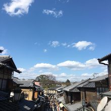 左右に和風的建物が左右にびっしりと立ち並び、緩やかな坂になっていて、土産屋がづらりと並んでいました。上から見ると、映画のセットのような雰囲気にも見えました。建物は2階建が多く、黒基調の色合いの建物が多かったです。
