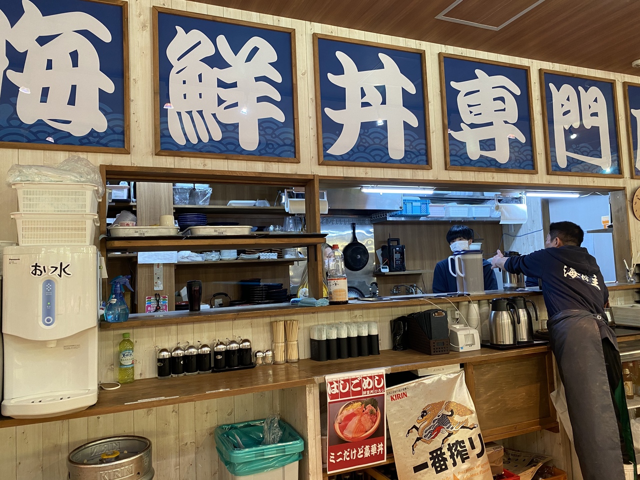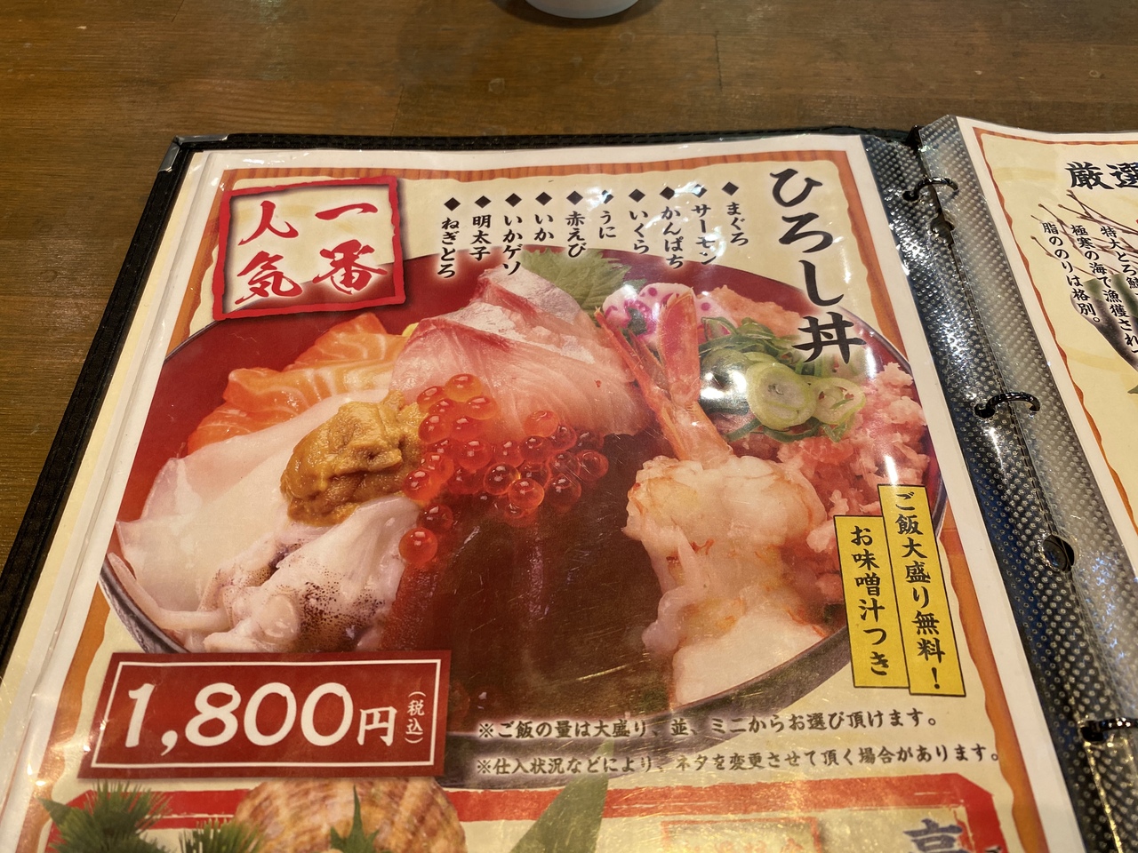 バスの時間もあり10:00開店の店ばかりの中ここはやってました。種類も豊富でリーズナブル。お店のオススメひろし丼を頂きました。大盛りで味噌汁付き。こちらでは明太子入ってました。その土地土地で海鮮丼の具が違うのがいいですね。