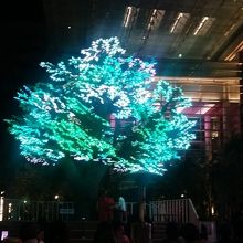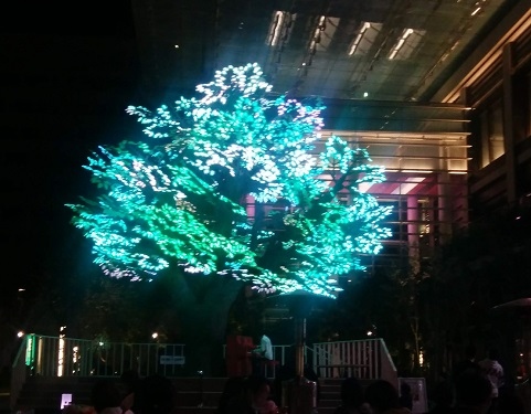 マンダリンオリエンタルホテル側の大屋根広場に誰でも弾けるストリートピアノがありました。ピアノの音だけでなく、ピアノを覆う樹のイルミ―ションが、演奏に合わせて色を変えて点灯するのも面白いです。
