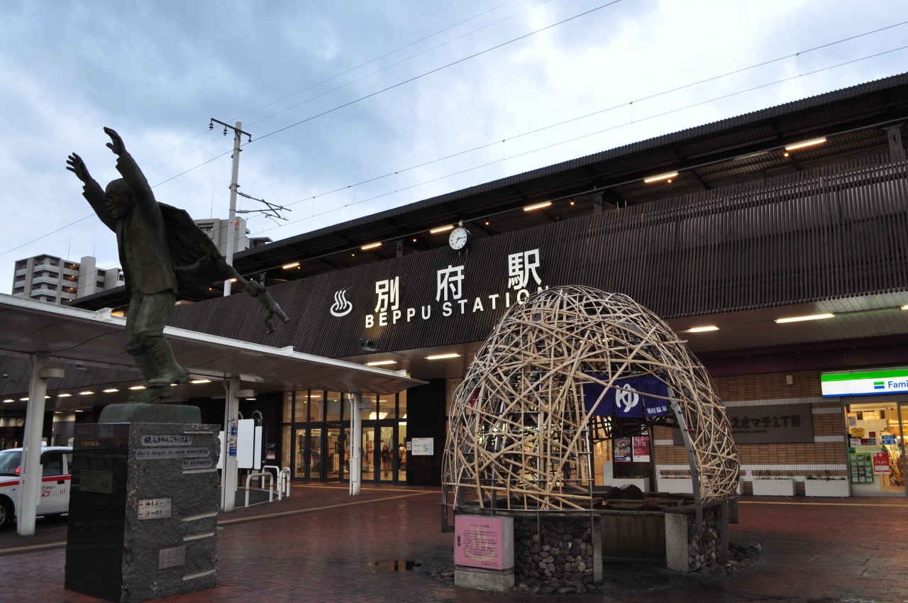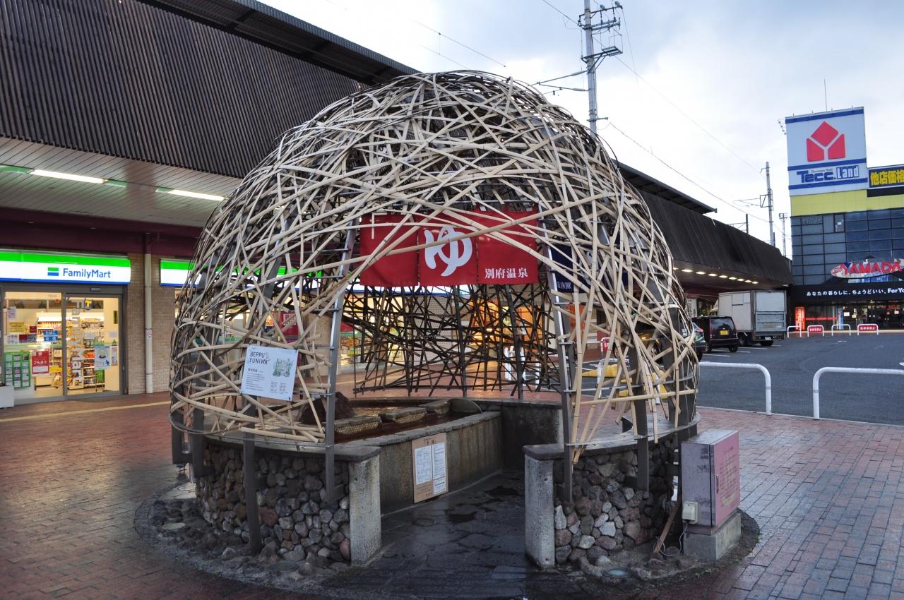 2020年3月に福岡~大分旅行をして別府に宿泊した際に立ち寄りました。別府駅の東側に出ると、出口のすぐ目の前に竹籠のようなドームの手湯があります。さすが温泉の都市別府といいますか、ここだけではなく市内のいくつかの場所に無料で使える手湯があるのを散歩中に見かけました。温度はちょっとぬるめでしたが、寒さ厳しい朝でカメラを持つ手がかじかんでいたのでこちらの手湯でしっかりと手を温めさせてもらいました。手湯のそばには油屋熊八像もあったので合わせて見学されると良いかと思います。