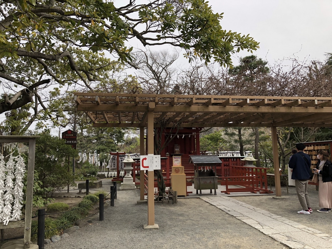鶴岡八幡宮の鳥居をくぐってすぐ右のところに源氏池があり、池を橋で渡った先にある島に、旗上弁財天社があります。島の周囲を取り囲むように、すき間なくぐるりと旗が立っている様は、壮観です。直径10mほどの小さく丸い島ですが、島の中には朱色の社殿があり、不思議な世界になっています。