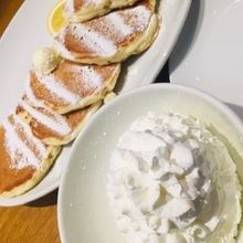 パンケーキは柔らかく口当たり軽いホイップクリームをつけながら食べると美味しいです。
