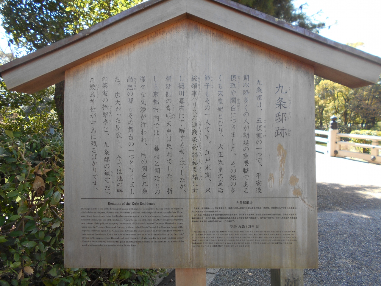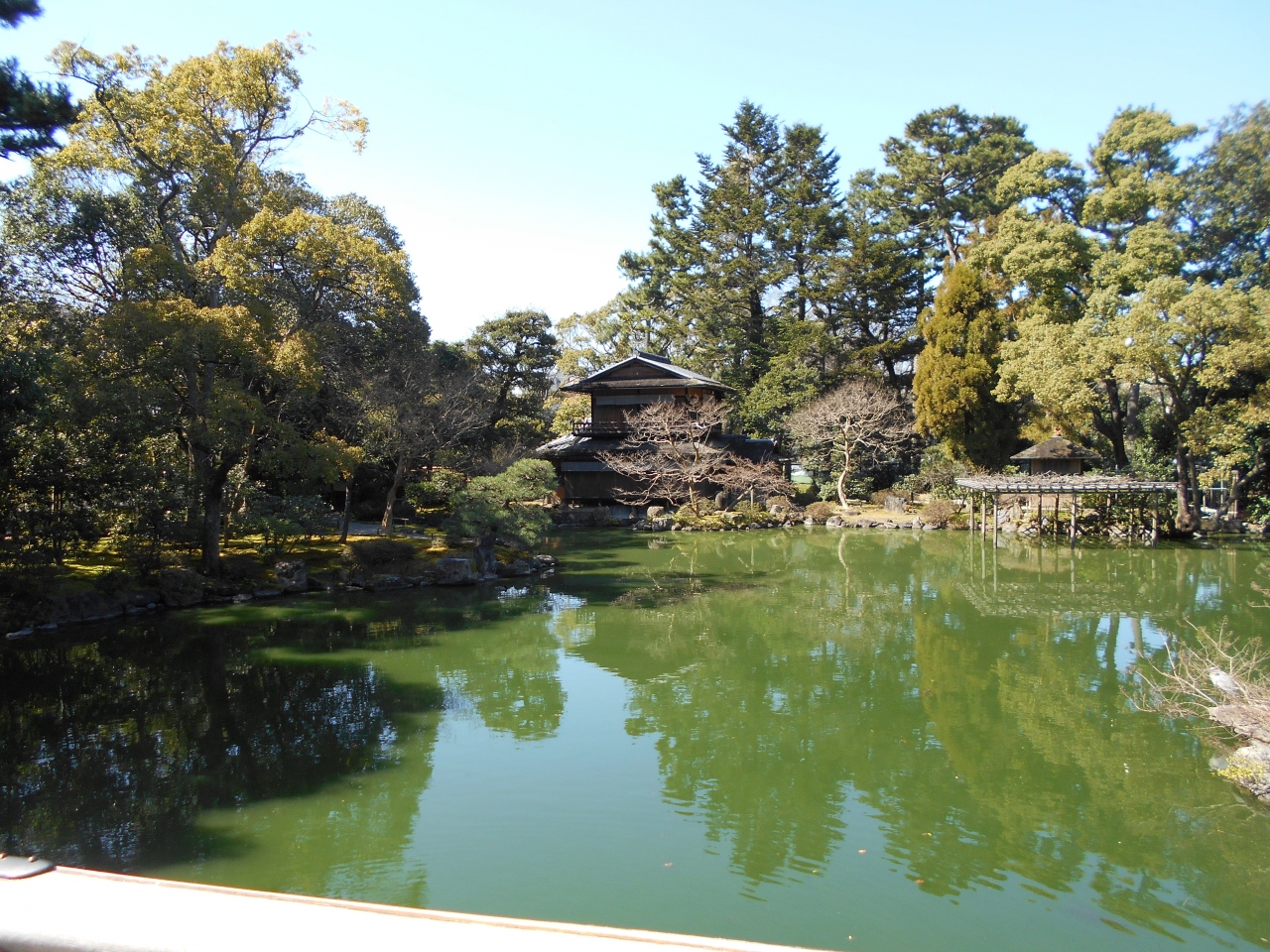 京都御苑南方の堺町御門の西側にある邸宅跡。五摂家の一つである公家九条家の旧邸宅跡で九条池の周りに茶室拾翠亭や鎮守社の厳島神社、池に架かる高倉橋などが配されて大変美しい姿を楽しませてくれます。庭園を囲む木々も見事で紅葉の時期は素晴らしい景観でしょう。