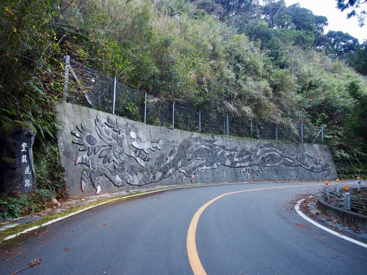 登龍道路があり、壁に大きな龍が2匹描かれています。