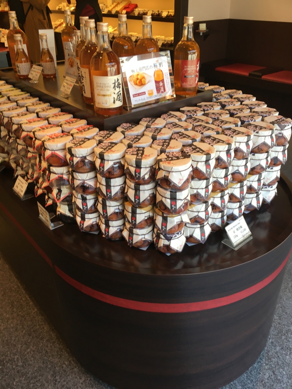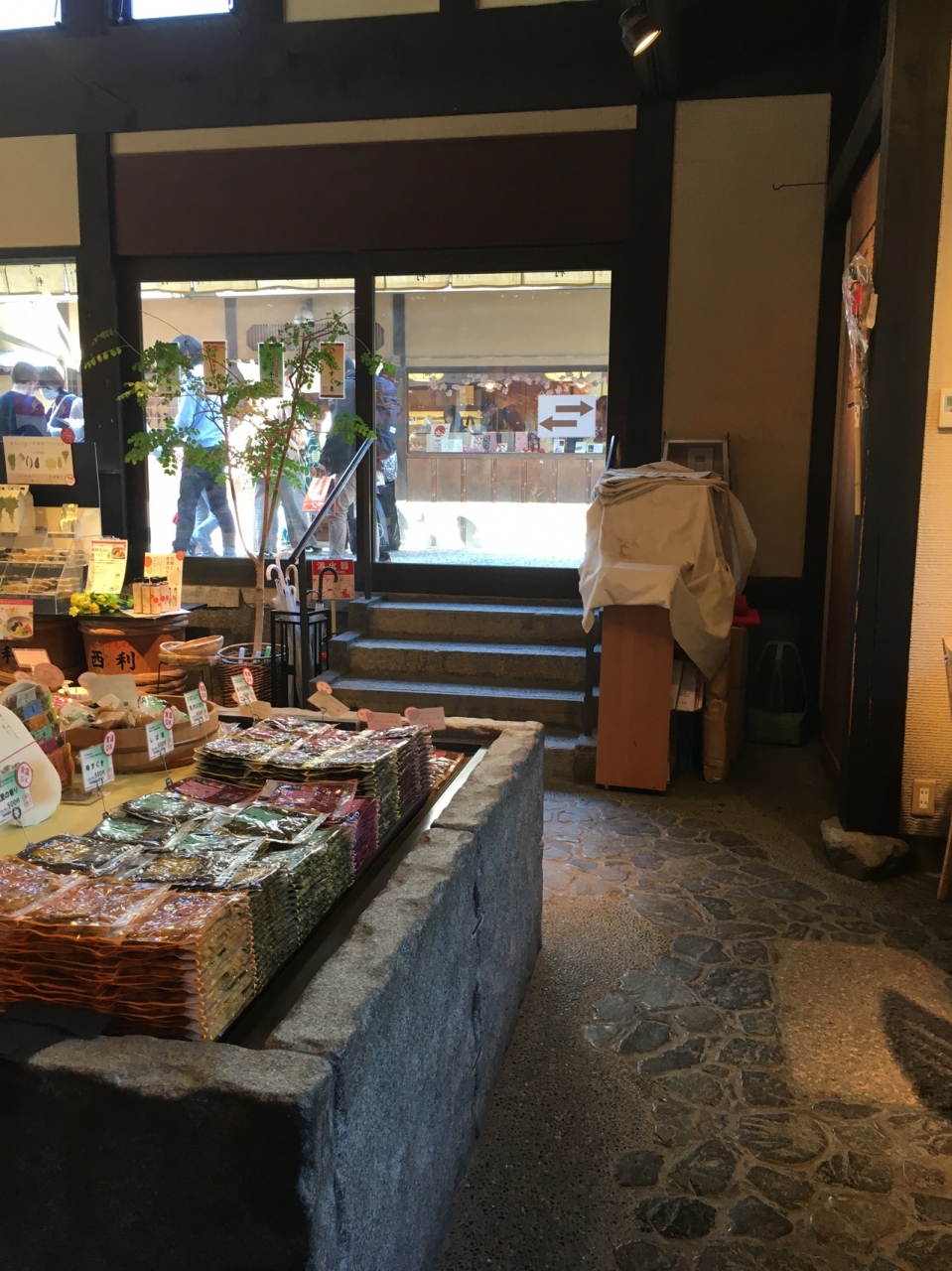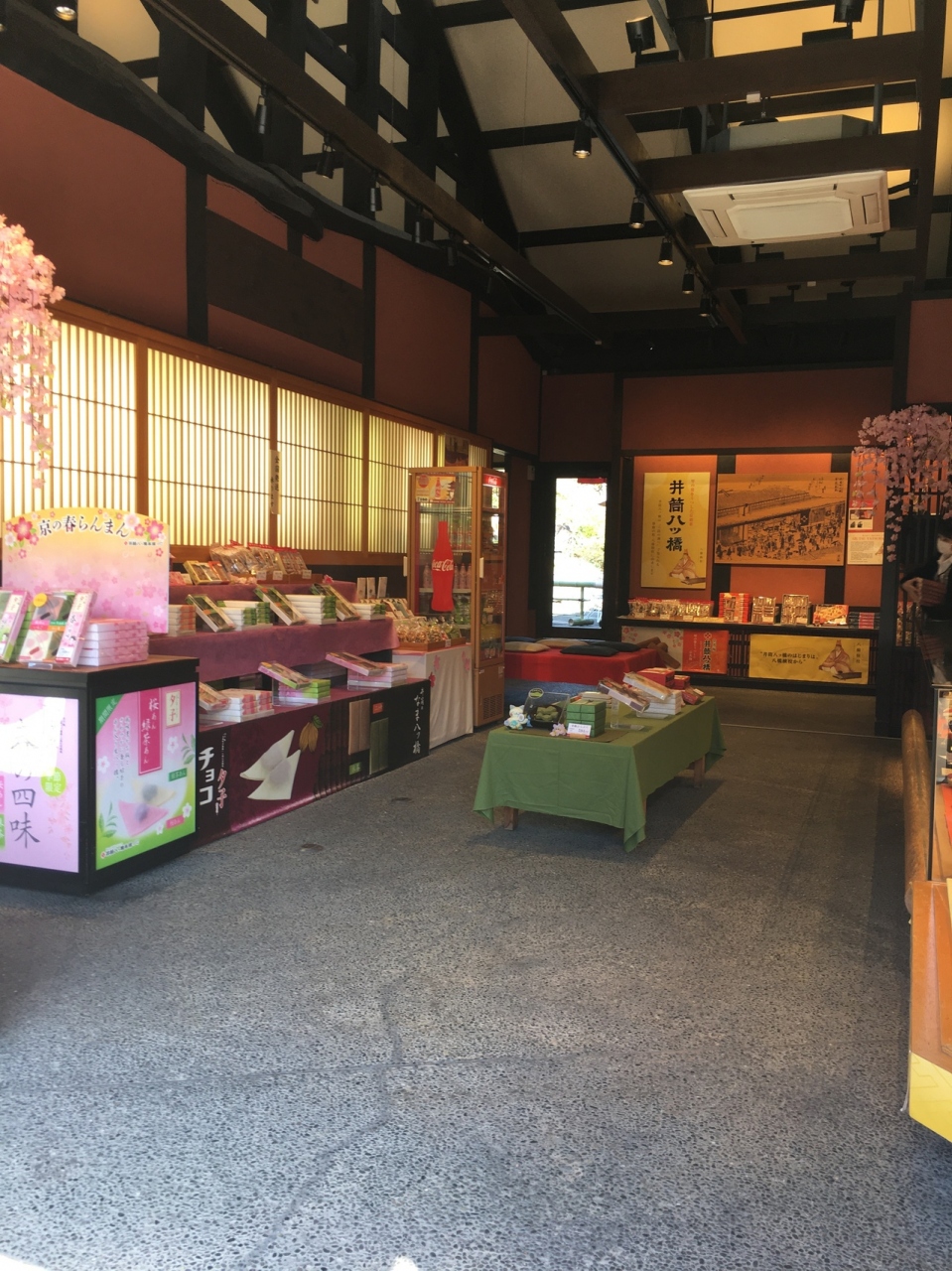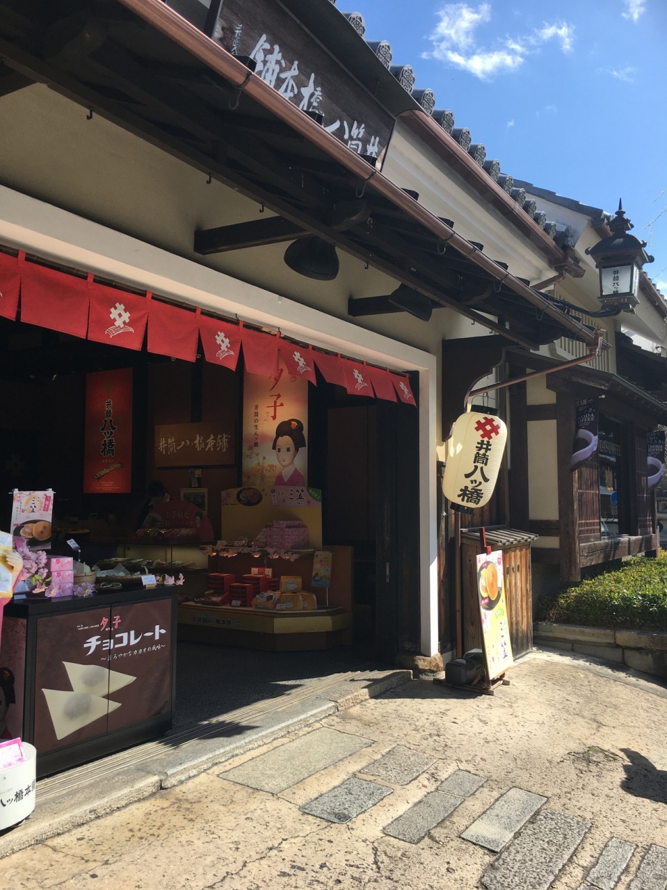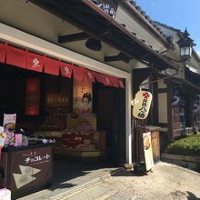 和風の店構えで定番の八つ橋が置いてあり、カカオ風味の八つ橋も置いてありました。八つ橋の他にはドラ焼きもありました。隣の店と繋がっていて、瓶詰めで、のり昆布、焼き梅干しと言うのがたくさん陳列されていました。