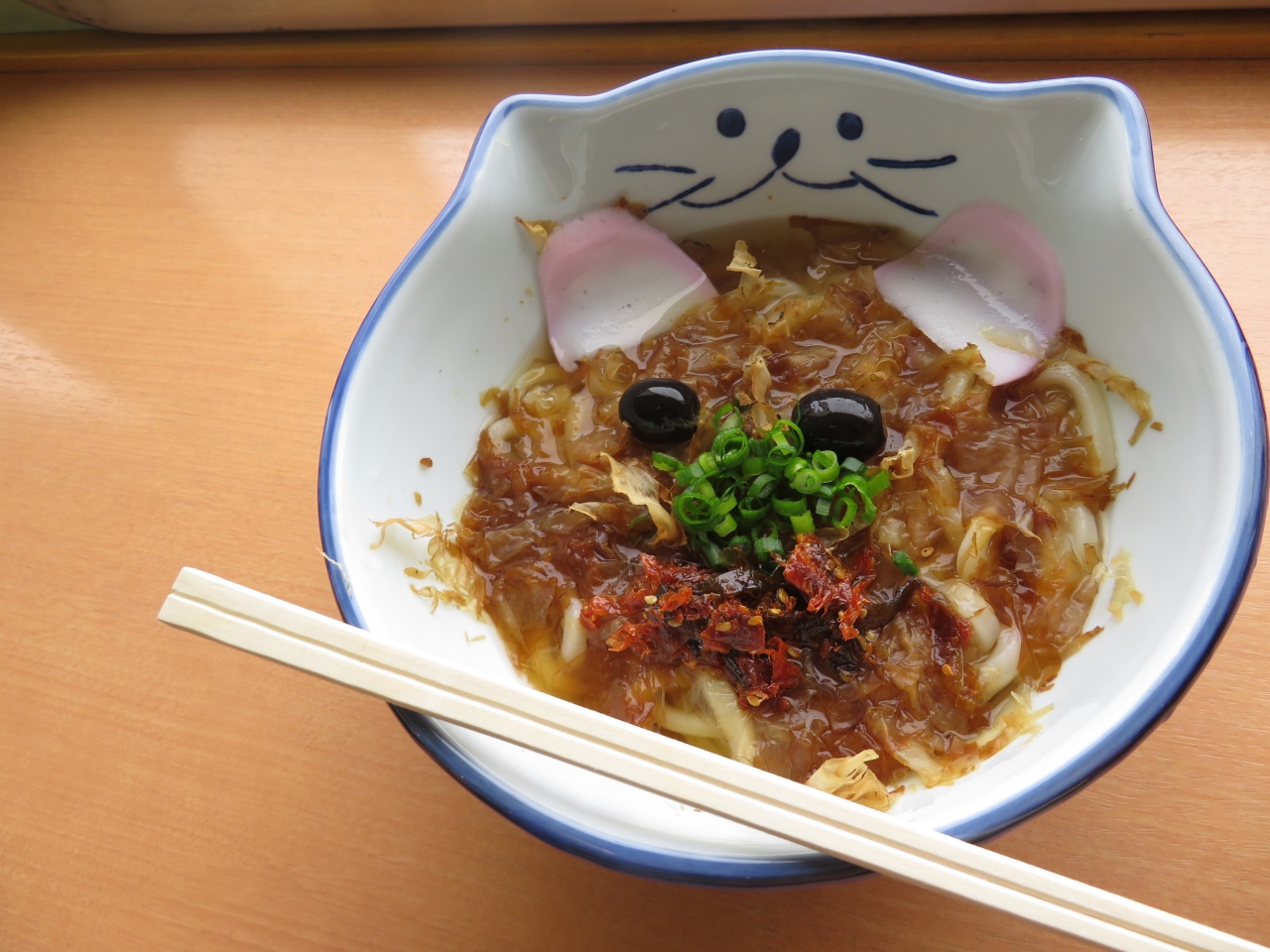 行きの楽しみは香川に向かうのですから船内で早速うどん食べられること!種類が増えていて、オリーブうどんの他にきつねうどん、肉うどん、にゃんこうどん(丼がネコの形でかつおぶしが乗っていました。)