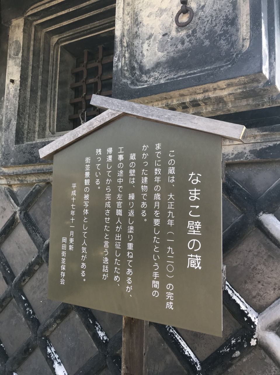 なまこ壁の蔵に向かう道は主要道路から入った道なので、あまり広くありません。なまこ壁の蔵の全体を撮影しようとすると、道幅を使うのですが、かなりギリギリです。重厚な壁は歴史を感じさせます。
