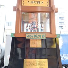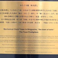 人形町の人形町通りの沿いの歩道にからくり櫓があります。両側の歩道に設置されていますが、私が見たのは江戸火消しの櫓です。1時間に一度からくりが見られるのですが、行った時間が早すぎてからくりは見られませんでした。11時からだそうですので、時間を見計らって行くと良いです。
