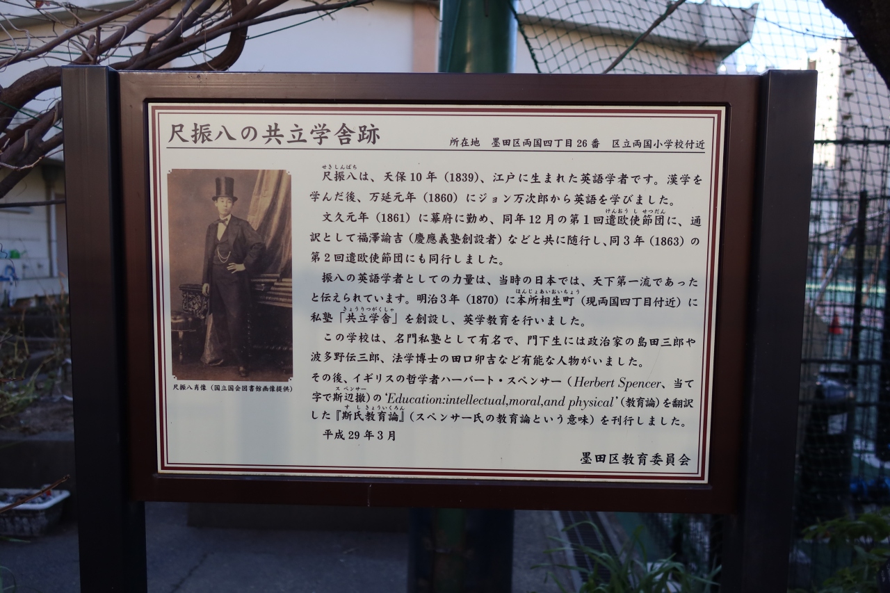 両国 本所にある両国小学校の校庭東側、両国公園に面した所に尺振八の共立学舎跡の説明板があります。尺振八はジョン万次郎より英語を学び、幕府外国方に通弁として務め、遣欧、遣米使節団の通訳として福沢諭吉らと海外を視察し、帰国後この地に共立学者を設立しました。慶応義塾とならぶ私塾が設立されたとは知らず勉強になりました。