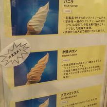 ソフトクリームの種類は3種類でバニラ、夕張メロン、メロンミックスでカップかコーンを選べます。