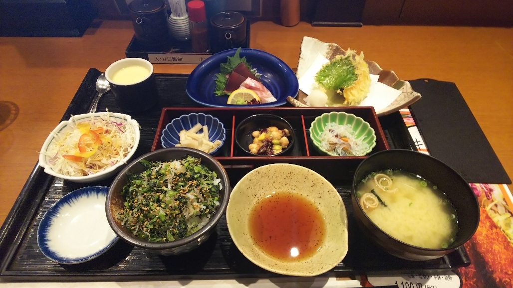 お昼に魚菜定食(1,080円)をいただきました。刺身二種、天ぷら、小鉢、サラダ、茶碗蒸し、ご飯、味噌汁のセットです。ご飯は「雑穀米」「白米」「野沢菜ちりめん」から選べます。女性の1人客も多く、幅広い年齢層のお客さんたちで賑わっていました。