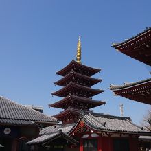 浅草寺へ参拝したときに境内にこちらがあります。他にもスポットがあるので、散策が楽しめる場所です。中には入る事ができませんので、外観を見るだけとはなります。遠くからでもいろいろな場所からみることができます。
