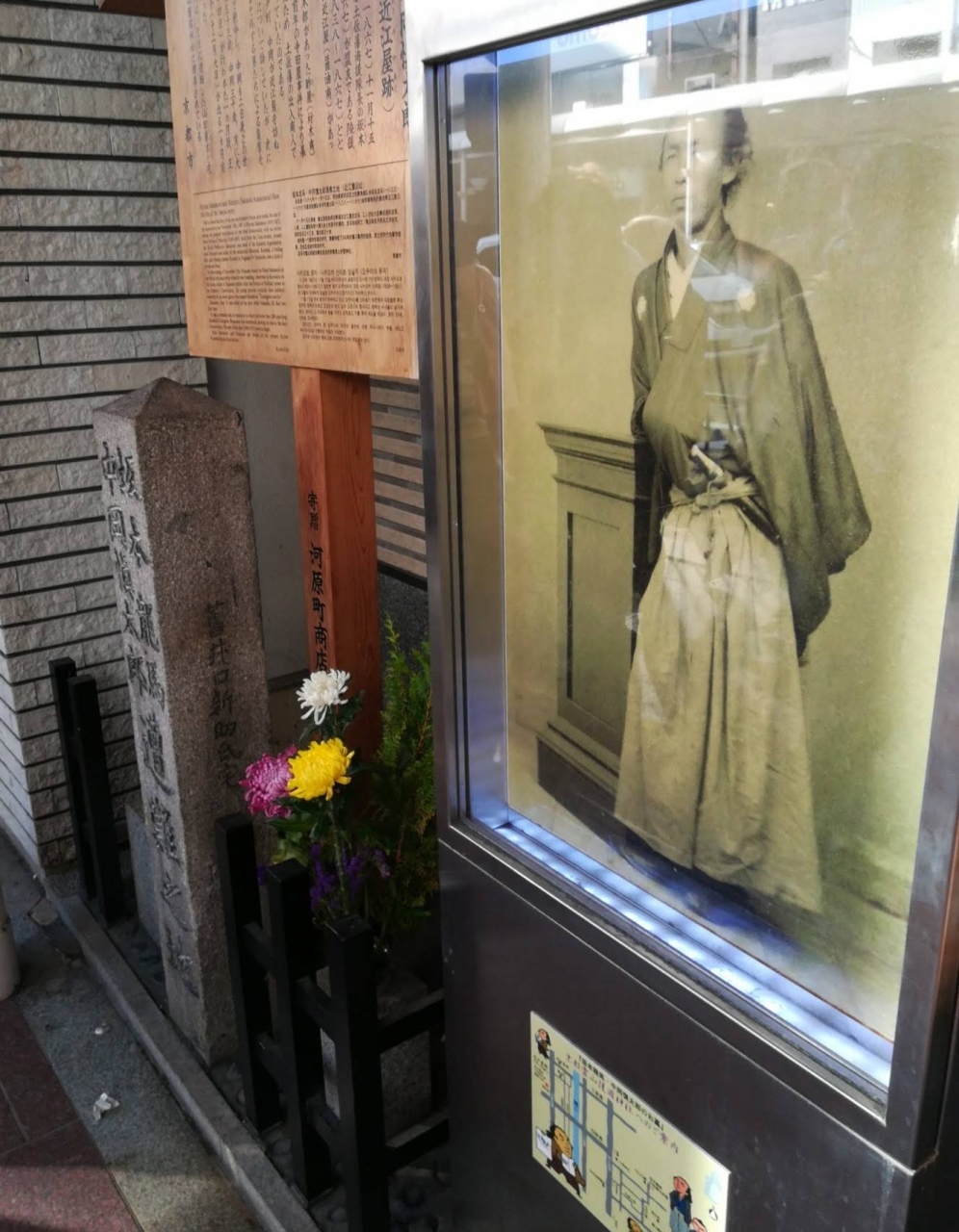 京都のメイン通りである河原町通りの三条と四条の間にありました。大通り沿いの繁華街なので、石碑だけかなと思っておりましたが、ここには昔は近江屋があり、両氏が暗殺されたことの説明板や坂本龍馬氏の写真もありました。