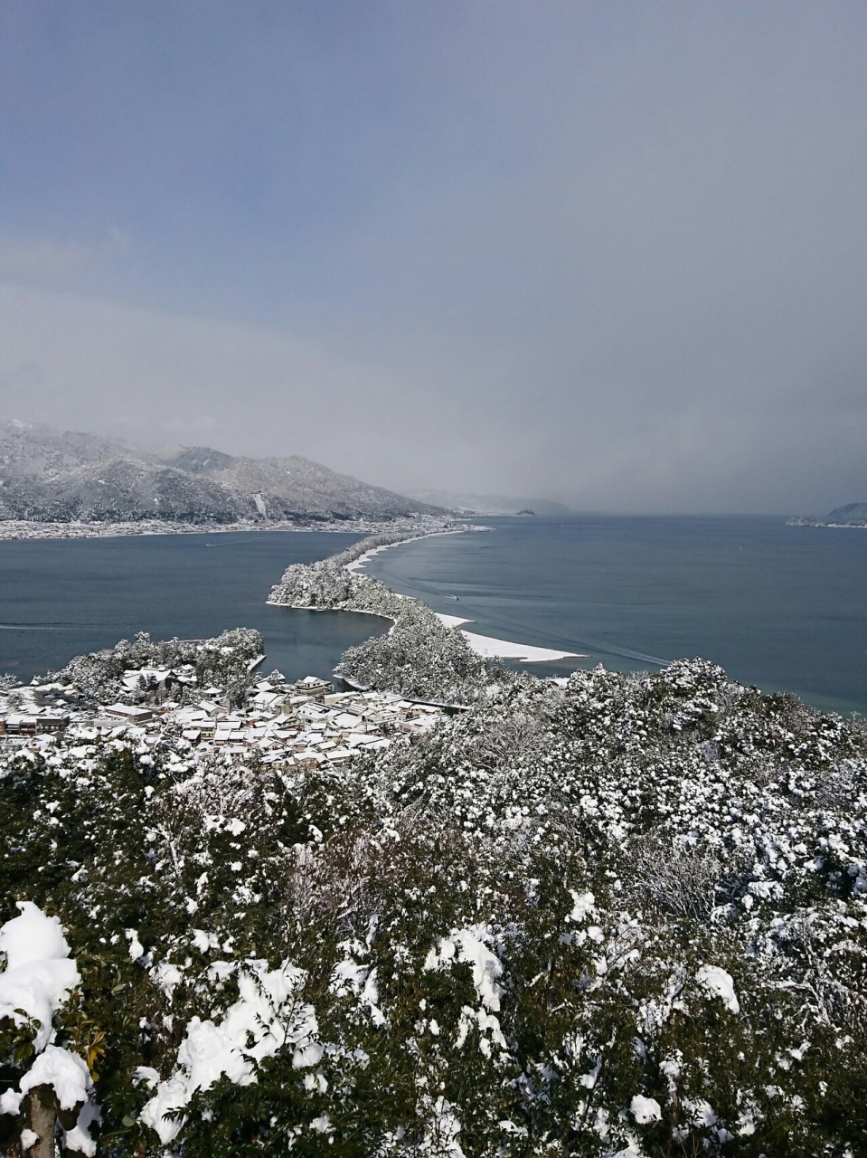 天橋立ビューランドから全景を見ることができました。さすが日本三景の一つ、素晴らしい景色でした。はじめはあまり天気が良くなかったのですが、徐々に晴れてきてラッキーでした。雪をかぶって白くなった天橋立、素敵でした。