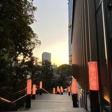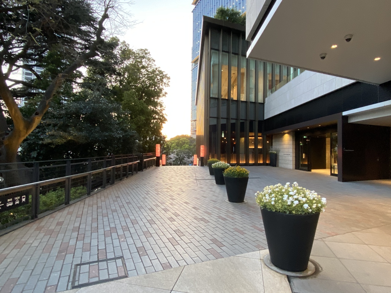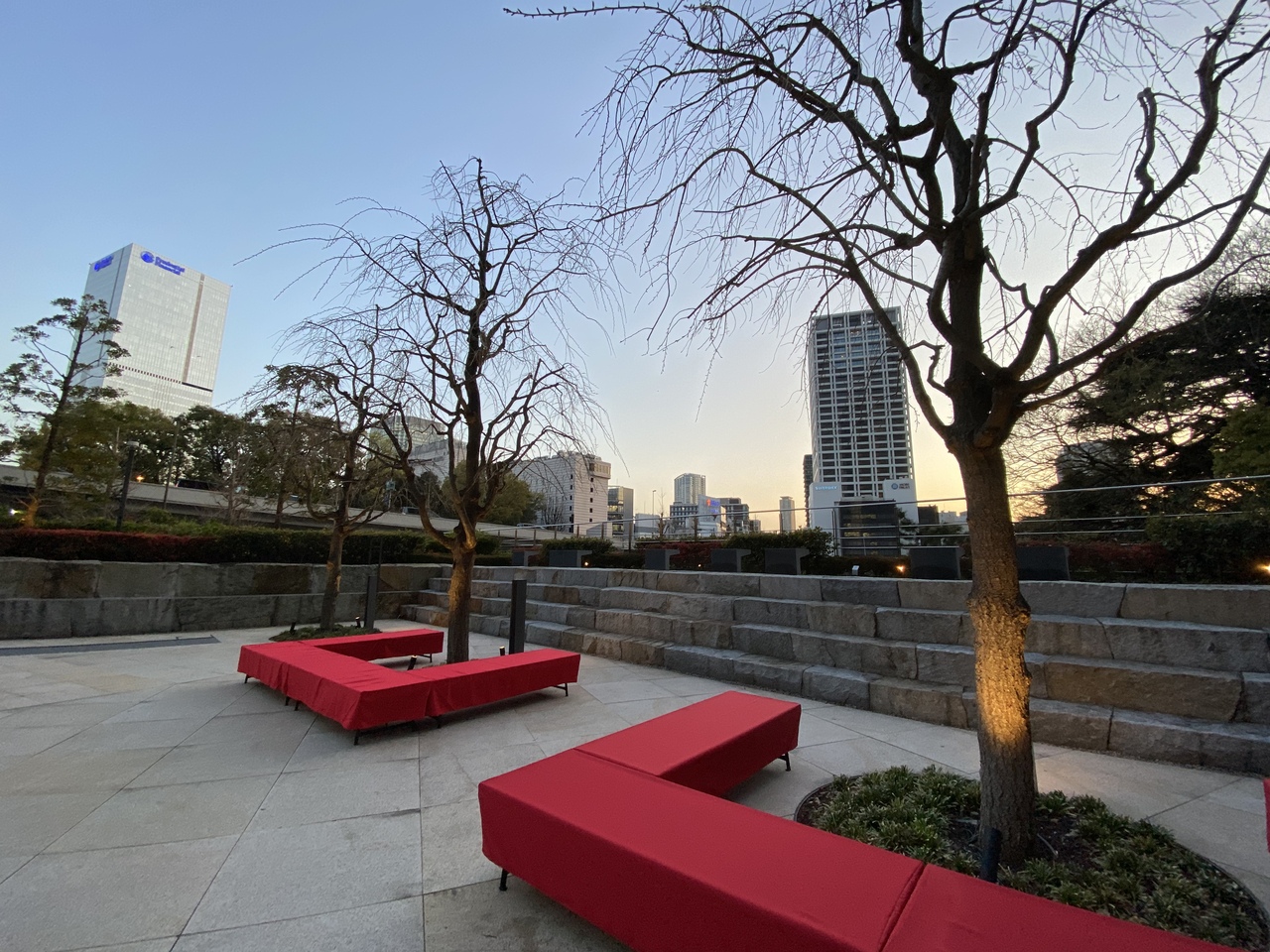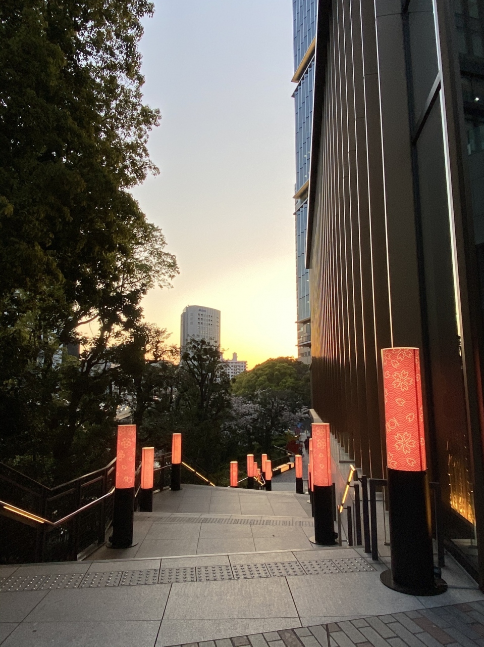 永田町駅直結、又は赤坂見附駅からニューオータニ方面、弁慶堀からも歩けます。弁慶堀は「ブラタモリ」でも紹介されていた事もあり、江戸城の外堀で石垣が見られます。東京ガーデンテラスはプリンスホテルと直結の複合商業施設で、お散歩路に可愛い桜の提灯が灯もり、ベンチには赤い布が敷かれていました。今の時期だけのものです。