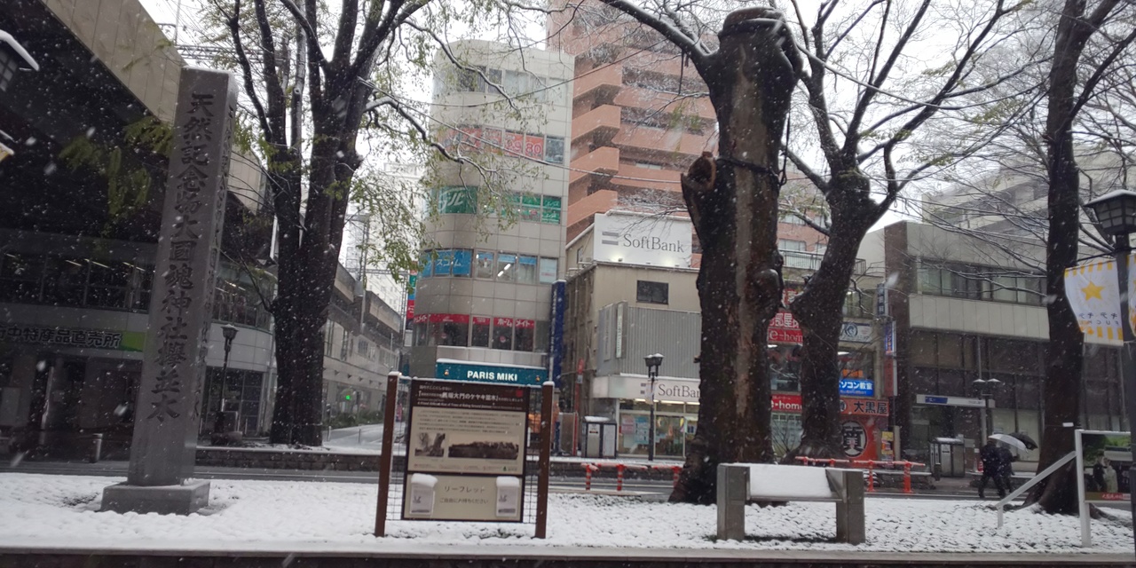大國魂神社の目に前にあるケヤキ並木ですが、春になると桜が満開になるのでそれを見に来る人がとても多いです。しかし、自分が訪れたときには雪が降っており桜は見えませんでしたが、雪なら雪で一風変わった景色になるのでそれも最高でした。