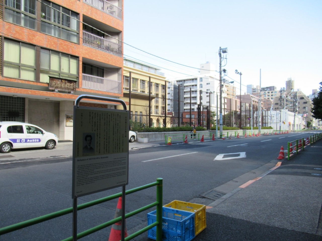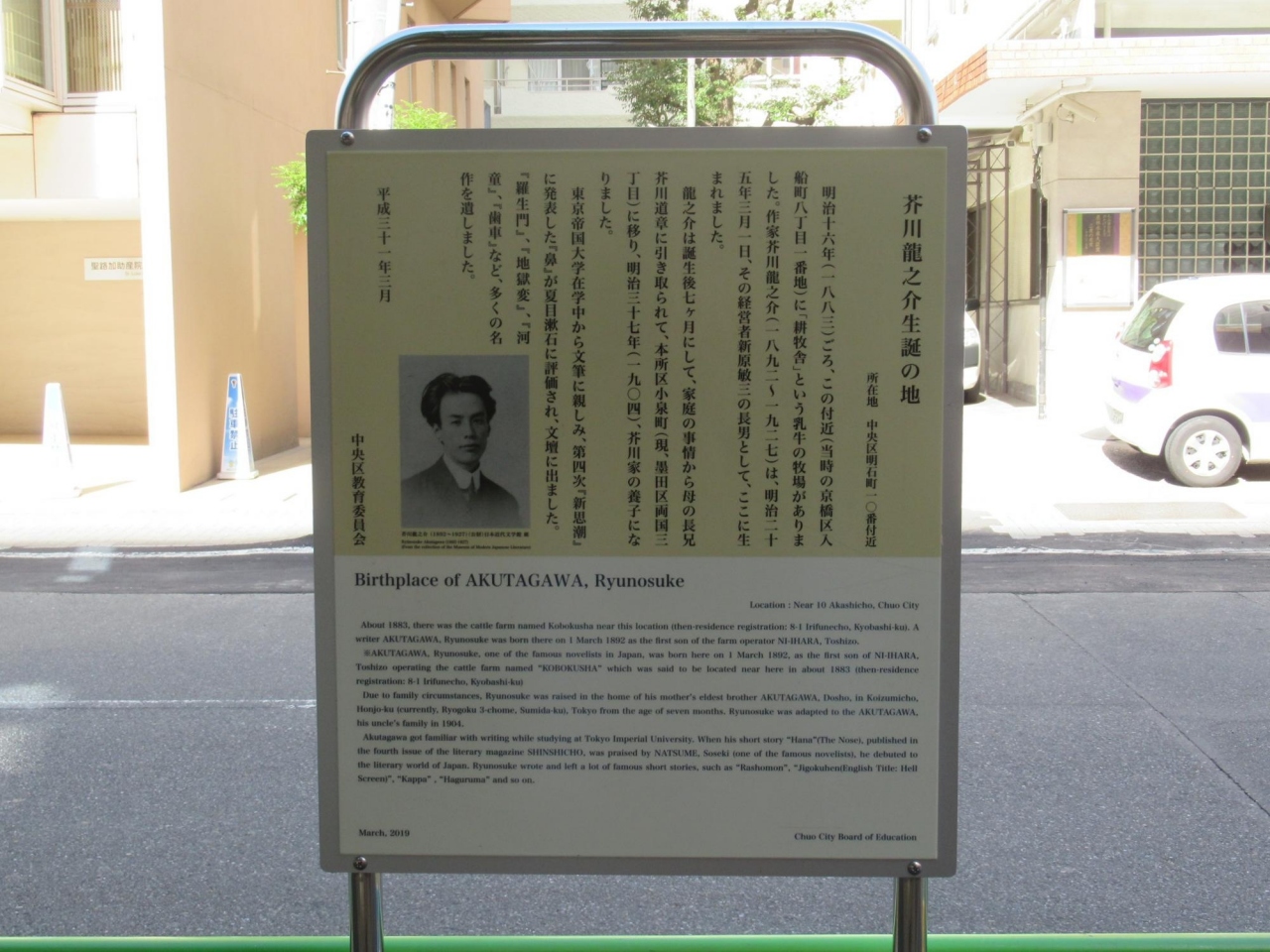 中央区明石町界隈を散策の折、聖路加国際大学の北側を走る居留地通りの大学側の歩道で見掛けたのがこの 芥川龍之介生誕の地 の肖像写真が付いた説明板で、車道側に歩道を向いて立ててあります。