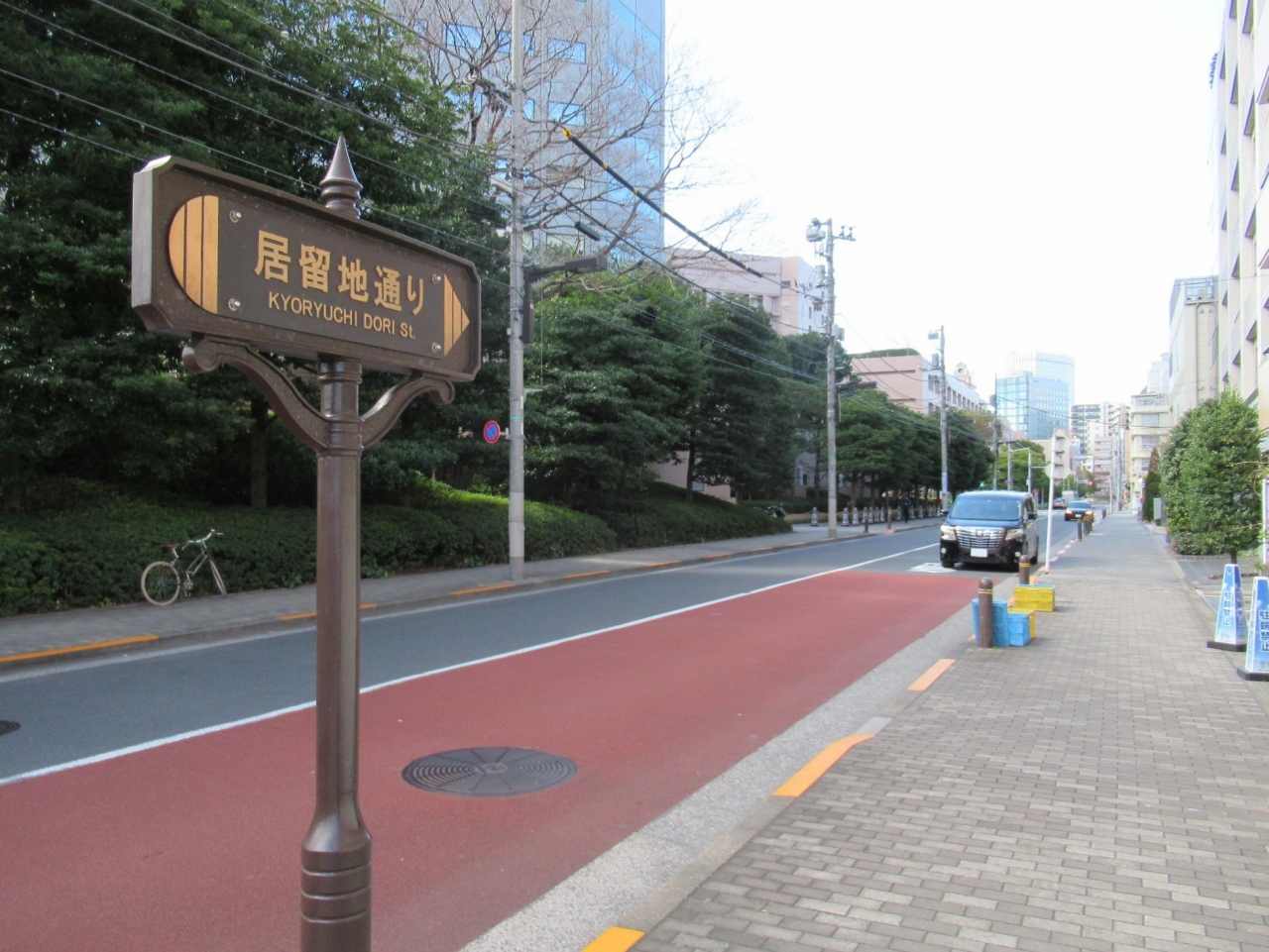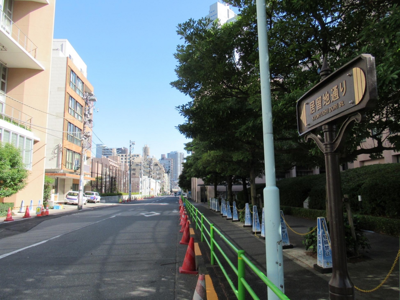 中央区明石町界隈を散策の折通ったのがこの 居留地通り で、聖路加国際大学北西角のT字路から一直線にほぼ東方向にある聖路加ガーデンの北東角までの凡そ400mの両側に歩道が付いた程々の広さの通りです。