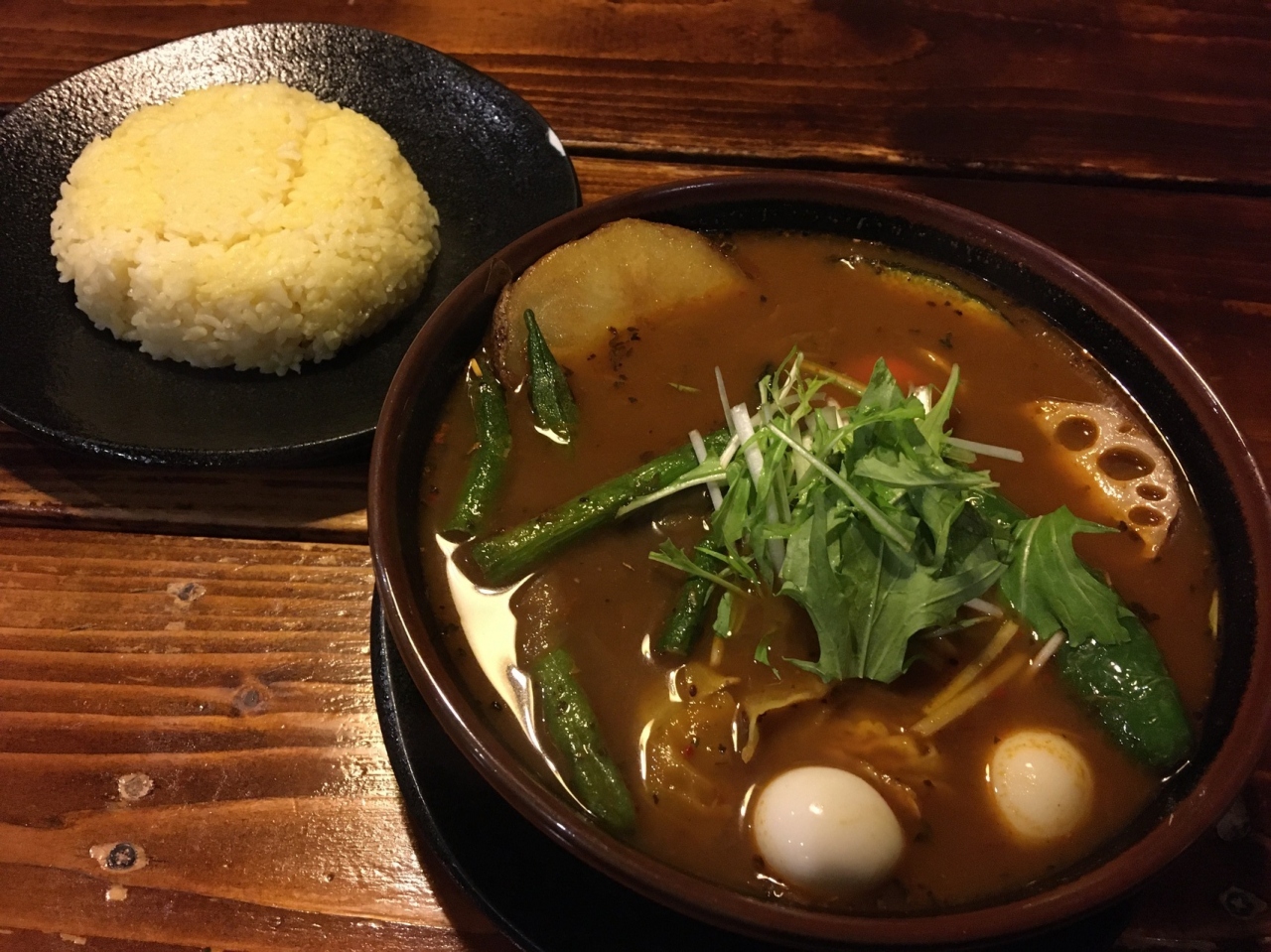 北海道グルメではスープカレーが一番好きです。「少し辛めが美味しい」のアドバイスに従って野菜カレーを辛さ8で、舌で感じる鮮烈な辛さと鼻に抜ける香り、素揚げ野菜の甘さで美味しく完食しました。空港利用前に立ち寄って良かった