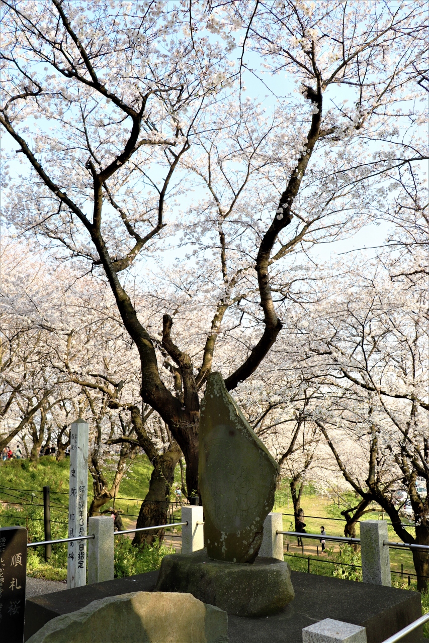 権現堂桜堤の巡礼碑は、その昔、人柱として川に沈められた(自身から川に身を投げたとの説もある)順礼の母娘の慰霊碑で、千本桜の立ち並ぶ土手にひっそりと立っています。