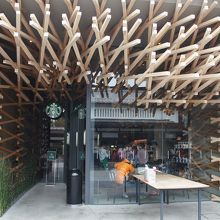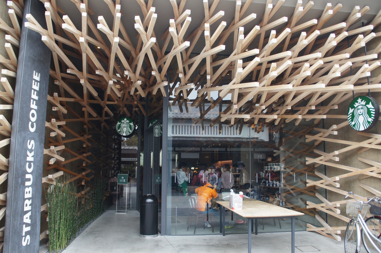 太宰府天満宮の表参道にあるスターバックスの店舗です。この店舗は建築が奇抜で、木材が使われた和の雰囲気の建物でした。有名な建築家である隈 研吾さんのデザインなのだそうです。週末だったこともあって店内はとても混雑していました。