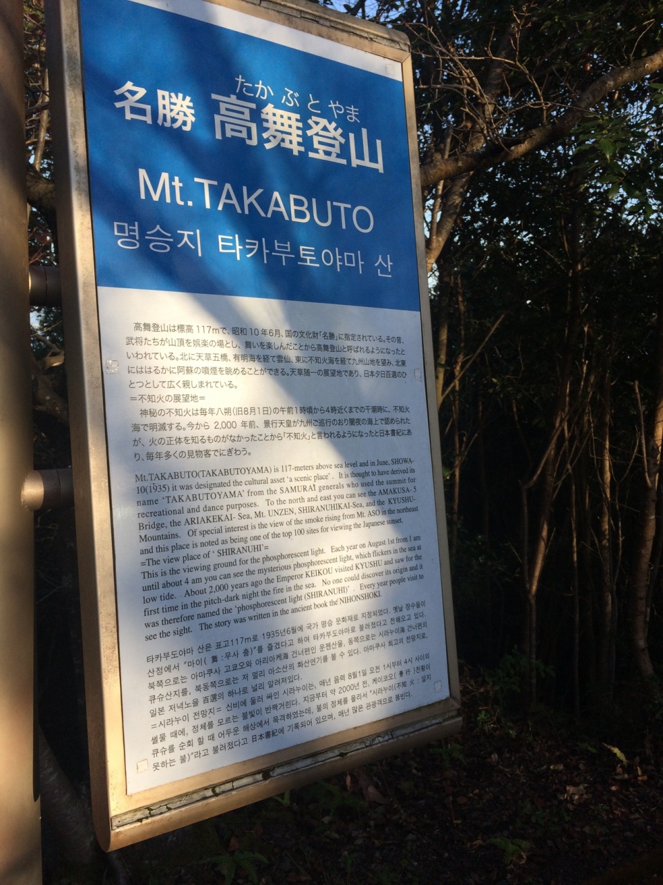 11月に九州一周旅行に行った際に妻と2人で観光しました。登山というほど、坂道は急ではなく、すぐ頂上に着きました。景色が大変良かったです。天草諸島が海に浮かんでいるのと太陽が良く見えました。多少風があり、帽子がとびそうでした。