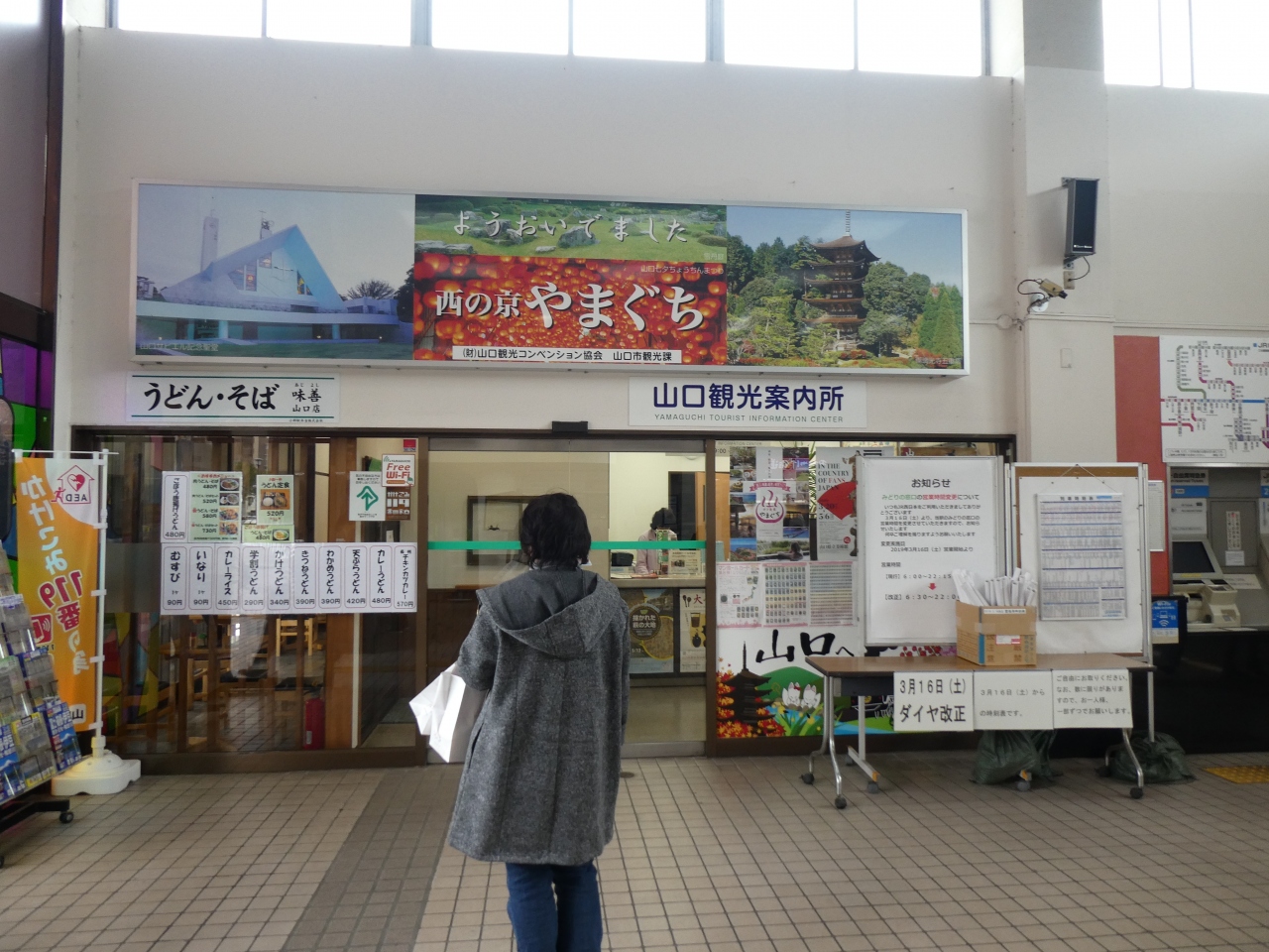 JR山口駅改札口を出てすぐ左手でうどん屋さんと一体化?してます。駅舎内に有るので大変便利です。