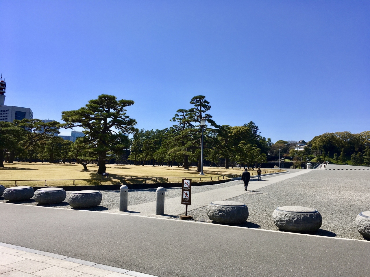 皇居前広場、内堀通りと外堀の間にある芝生の緑地のあたりを皇居外苑と言います。馬場先門から楠木正成像、売店くすのき、楠公レストハウス、クロマツ林と見て歩いて、皇居前広場へ進み、皇居正門、二重橋、伏見櫓などを臨みました。