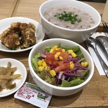 おかゆのセットに鶏唐をプラス。サラダがけっこうしっかりしていて嬉しいです。