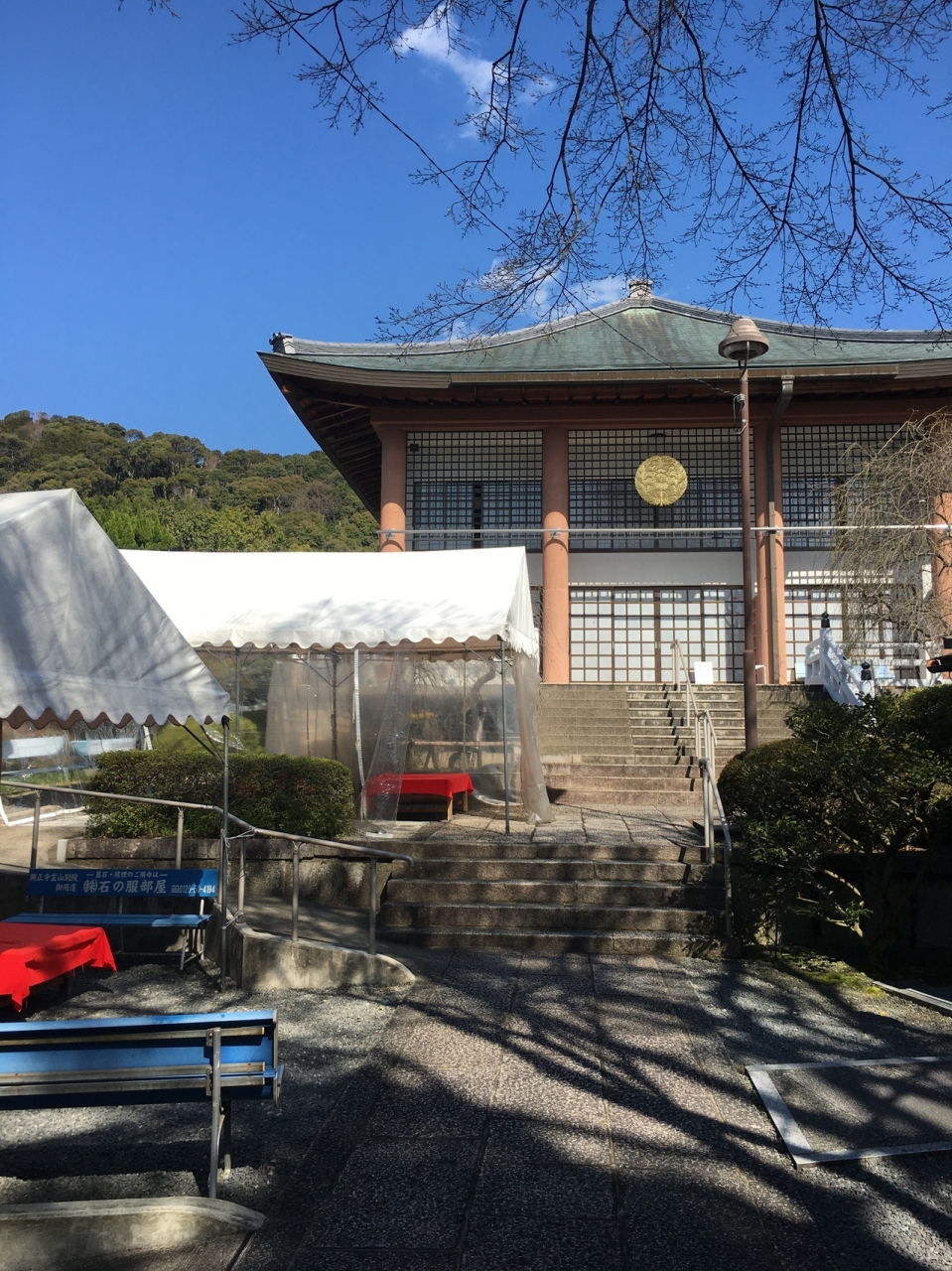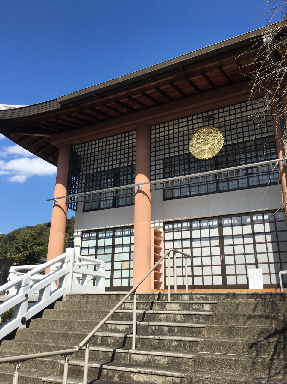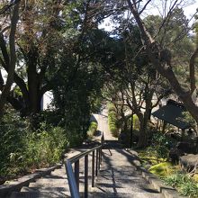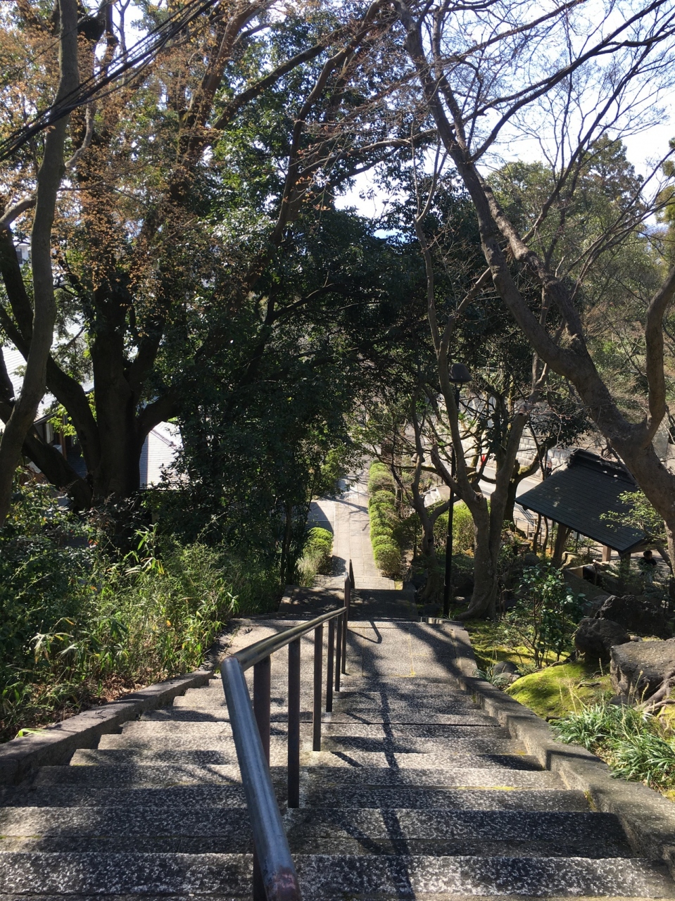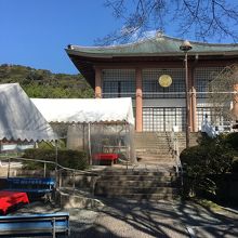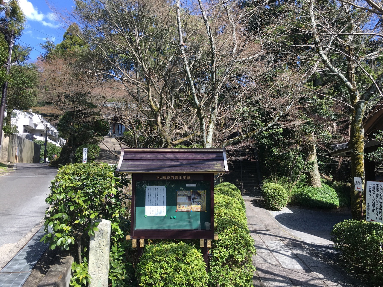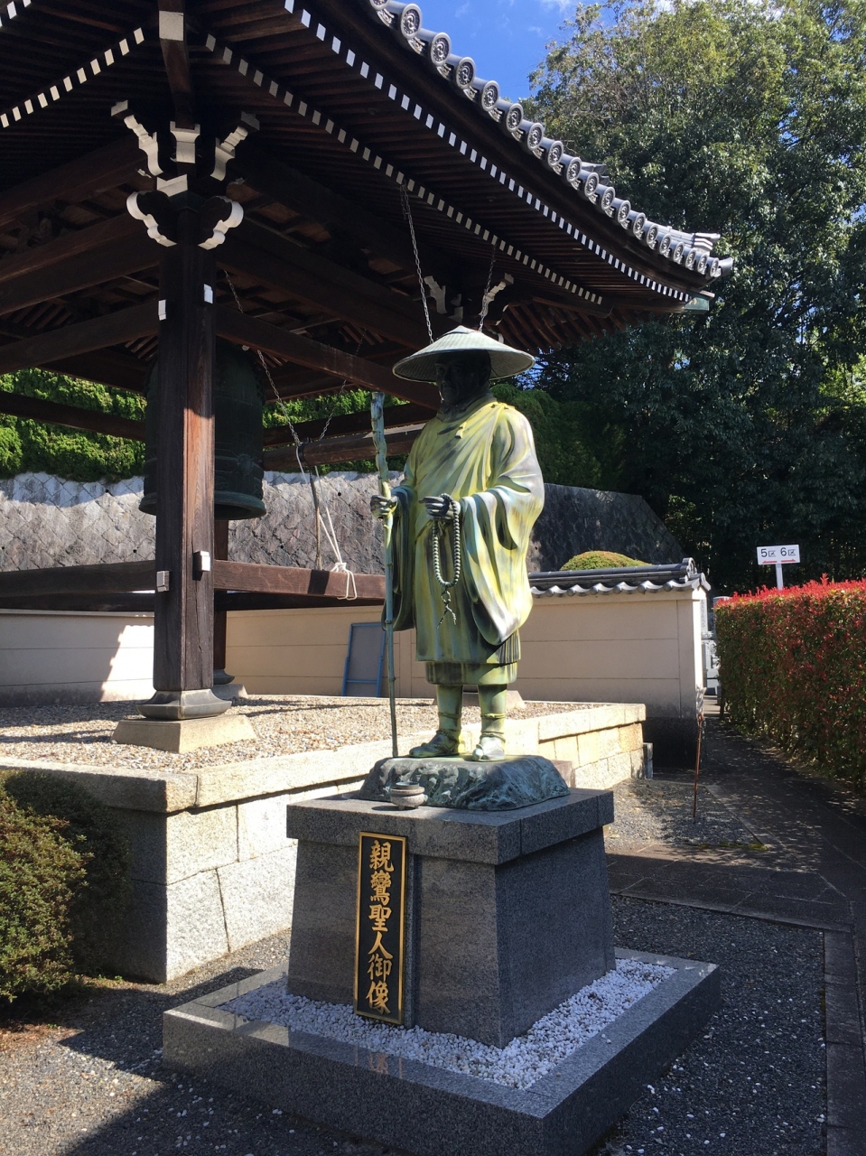 境内まで直線上に道が伸びていて、緩やかな坂道でした。道の左右には木や草が整備されていました。境内へは階段を上がることとなり、急な階段でした。本堂の建物は近代的で、下には親鸞上人の像と鐘がありました。境内より境内に向かう道のりが良かったです。
