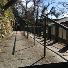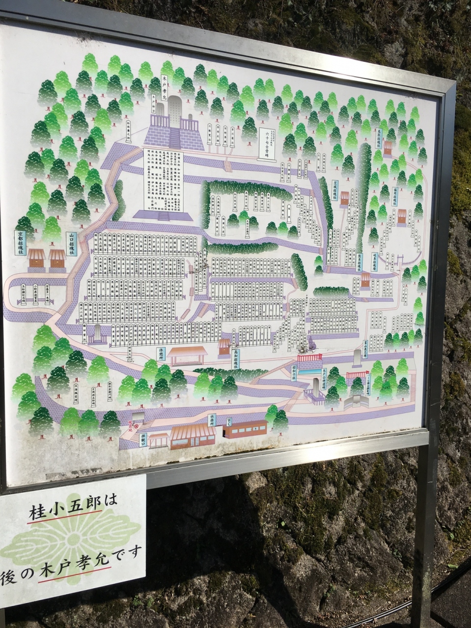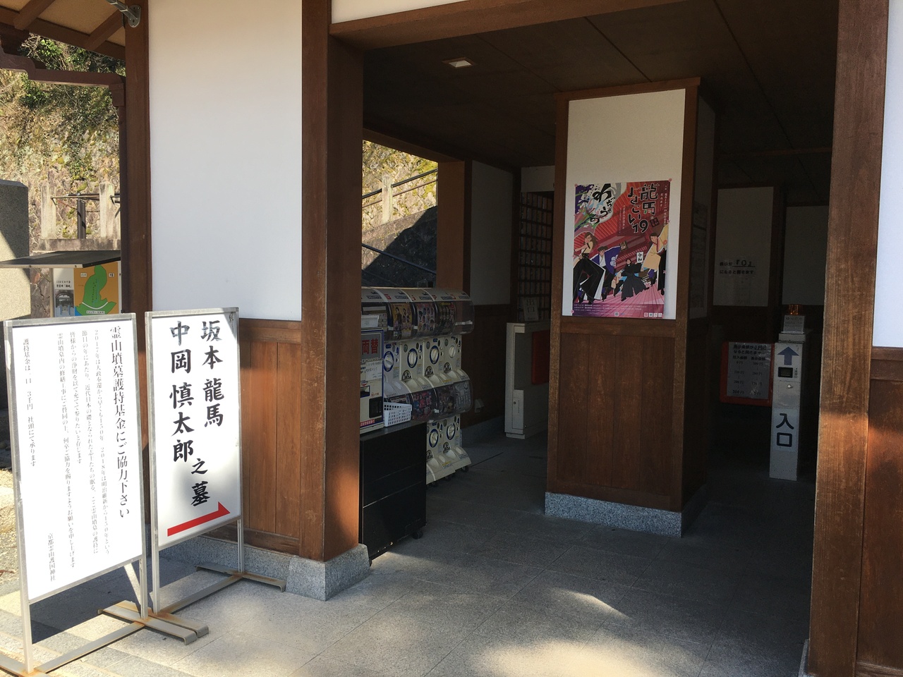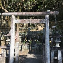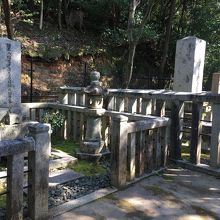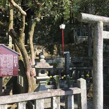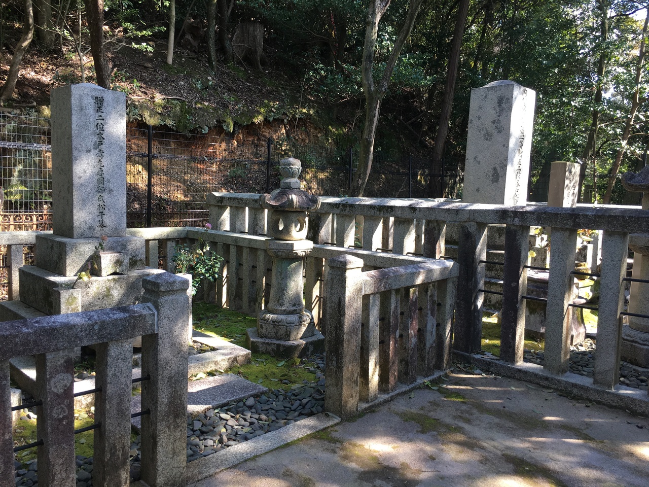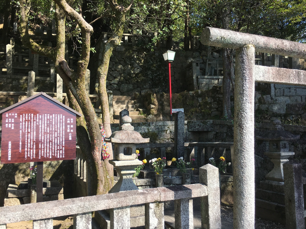 霊山護国神社の裏山にあり300円の入場料がかかります。山の裾野のお墓が立ち並んだ場所にあり、下から行くと一番最初にあるお墓で看板もあり、鳥居もあって千羽鶴もありました。石の囲いに囲まれて参拝客が絶えない場所でした。