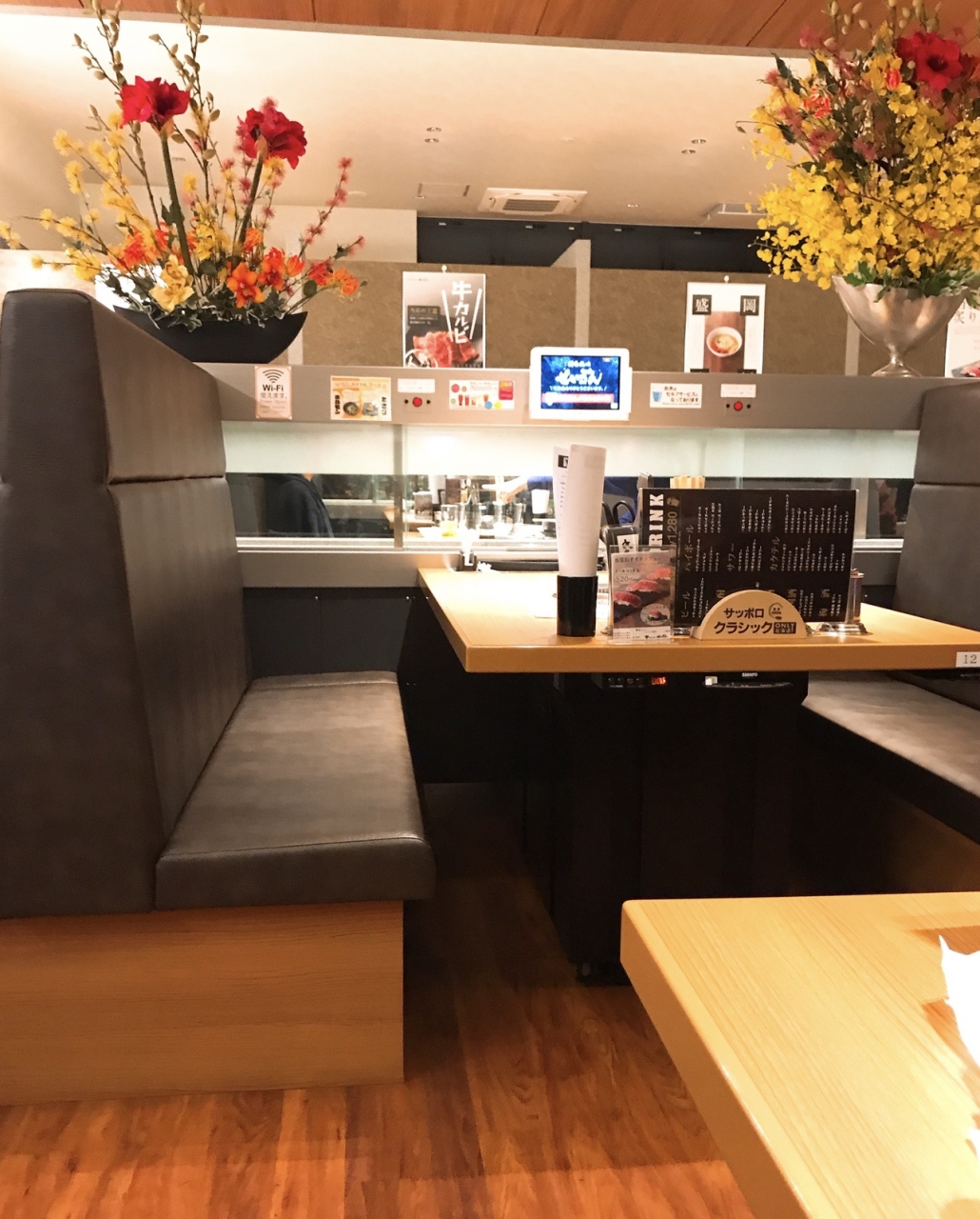 タッチパネルで注文するとアナウンスの後テーブル横のレーンで肉が届いて、扉がオープンして皿を取り出し壁のボタンを押して閉じるという一連の動作が必要です。