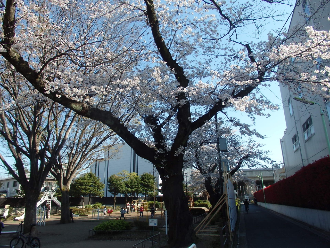 北沢川緑道散歩中、ユリのき通りにある山下公園に寄りました。園内には砂場、滑り台、ブランコ、鉄棒、ジャングルジム、グローブジャングル、スイング遊具等の子供遊具がそろっている児童公園で子供連れ家族にお勧めです。もちろんトイレもあります。近くの保育園の園児たちが、先生に引率されて遊んでいる光景が見られます。また小さな子供を連れたヤンママの憩いの場にもなっているようです。身近な公園なのですね。園内にある数本のソメイヨシノが満開でとても奇麗でした