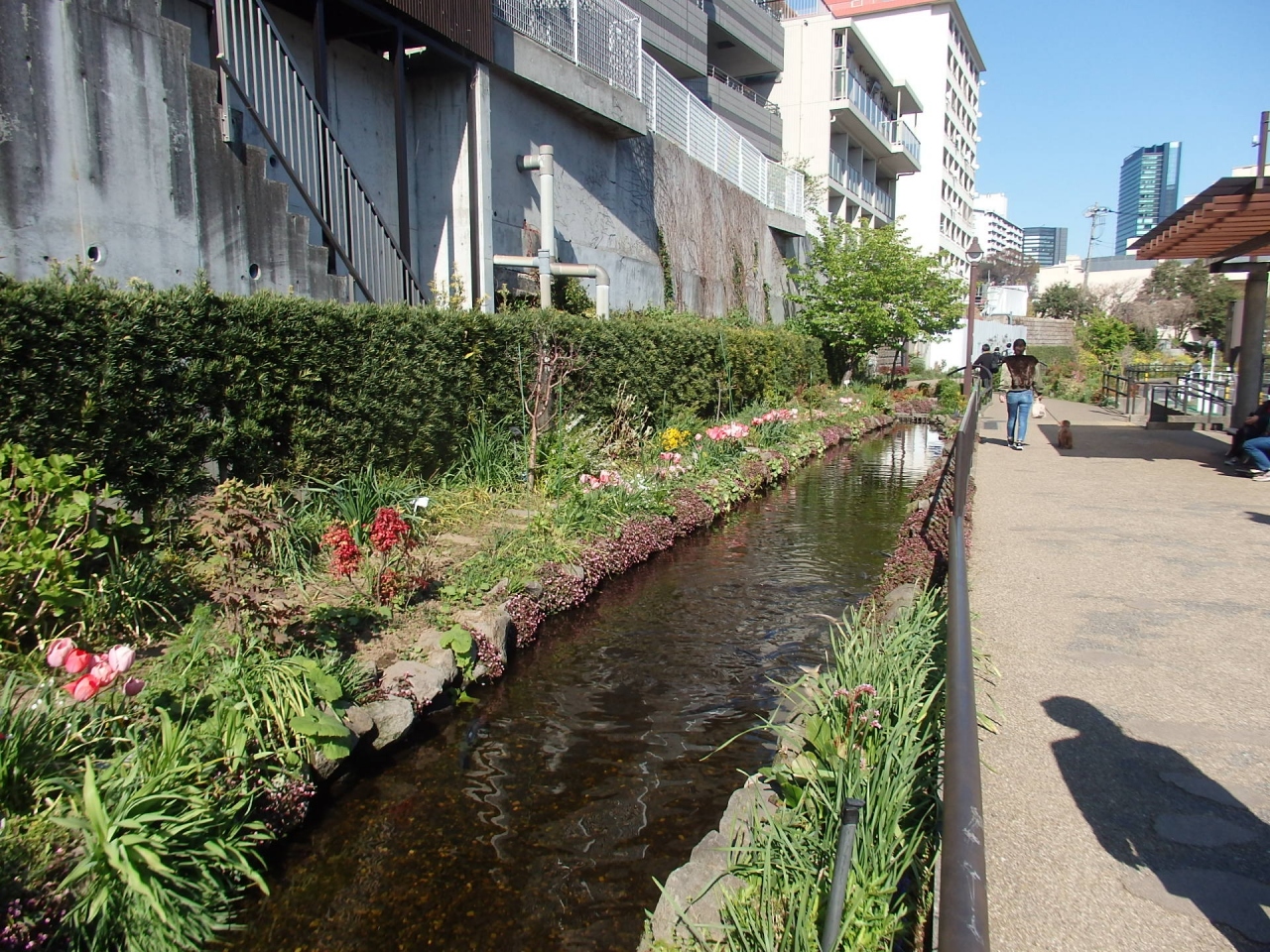 てくれます。今、本数は少ないですが桜が満開、その他カジイチゴ、サツキ、アセビ、チュウリップ、菜の花、ネコヤナギ等が迎えてくれました。更に国道246号線を渡ると、開渠された目黒川両岸に満開の桜が見られます。桜の季節に行けば楽しみが倍加します