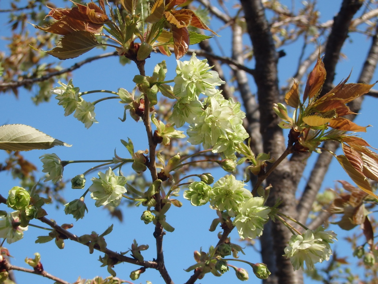 新宿御苑新宿門から入園しました。ソメイヨシノの時期程多くはありませんが、多くの人が入口に並んでいます。新宿門から左手のサービスセンターの方に向かいます。ソメイヨシノは葉桜になっています。一葉、関山、普賢象、妹背、白色大輪のワシノオ(始めて見ました)が満開で見られます。丸花壇の南、十字路(N2ポイント)付近に本命の一つウコン桜(十数年前、大阪造幣局の通り抜けで見たのが初めてです)が2本あり、満開です。薄黄色の八重の桜で、花期後半になると花中心部が徐々に赤くなってきます。大木戸休憩所、玉藻池の外周部、プラタナスの並木があるフランス式庭園を過ぎた南にウコン桜、本命の一つ御衣黄があります。御衣黄は八重で先始めは薄緑色をしており、徐々に色が淡黄色になります。満開時には、花の中心が赤くなります。この付近には他に菊咲の淡紅紫色の梅護寺数珠掛桜(京都にある佐野邸庭園で見たことがあります)が見られます。ツツジ山付近で、ウコン、市原虎の尾、ソメイヨシノの父親で単重白色のオオシマザクラ、太白等が見られました。ソメイヨシノは一目鮮やかですが、飽きがきます。本日見た種々の桜は変化があり、飽きがこないので楽しめます。桜以外、ヤマブキ、躑躅、ミツバツツジ、ドウダンツツジ等が見られ、花ファンにとっては有難い公園です