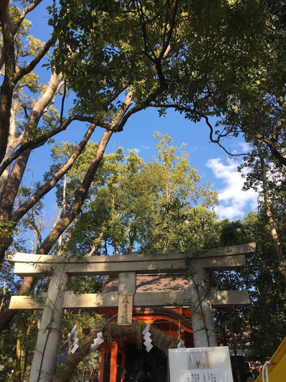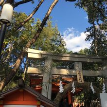 西楼門を潜り右側に、3つの神社がある左端にありました。どの神社も同じような感じに見え、境内はなくグレーの鳥居の下にはしめ縄を丸くしたものがあり、しめ縄を潜って参拝します。社殿は祠を少し大きくしたような建物でした。
