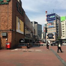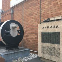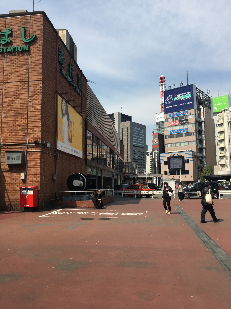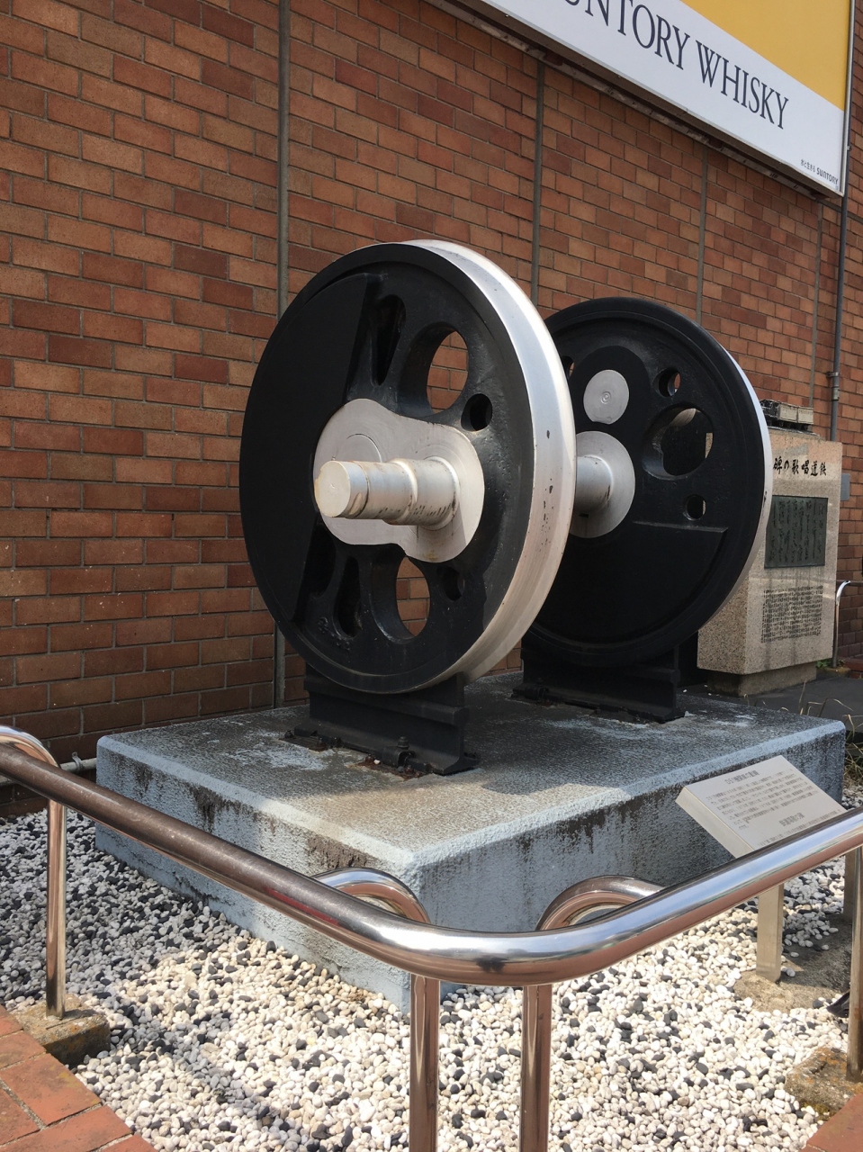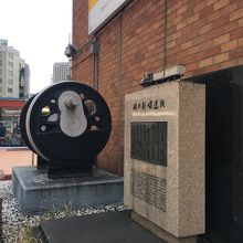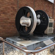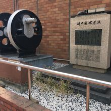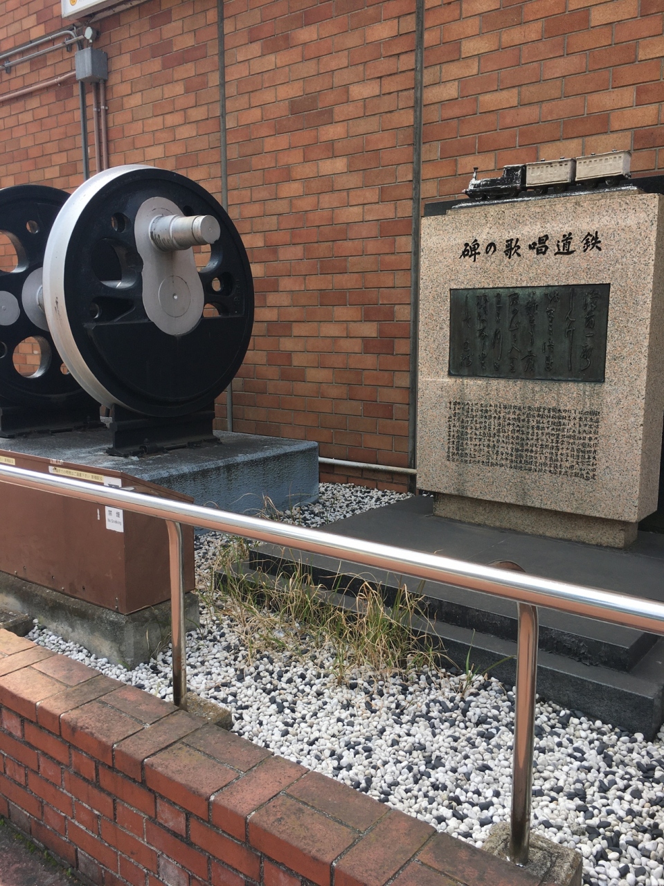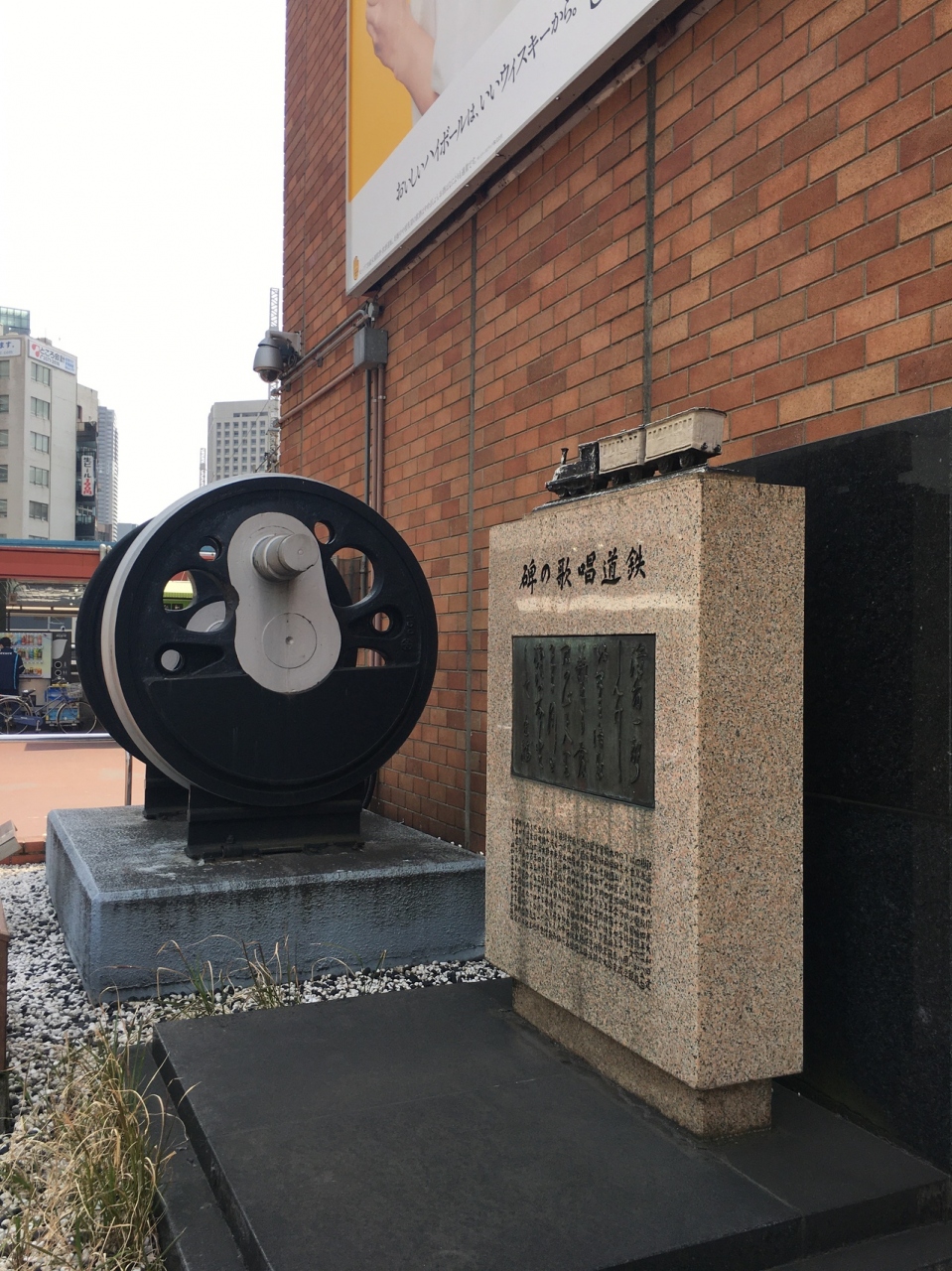 新橋駅汐留口を出た壁沿いにあり、歌の碑より鉄道の車輪の方が目立ちました。正方形の石碑には、文字が書かれていましたが読みにくいかったです。石碑の上には、古びた汽車と客車2輌の模型があり、良い感じでした。