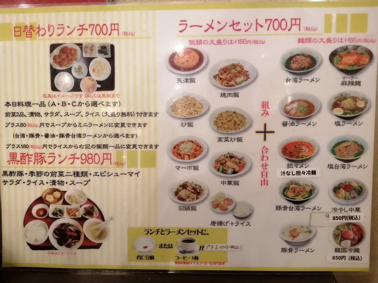 日替わりランチとラーメンセットは税込み700円で、黒酢豚ランチは980円。