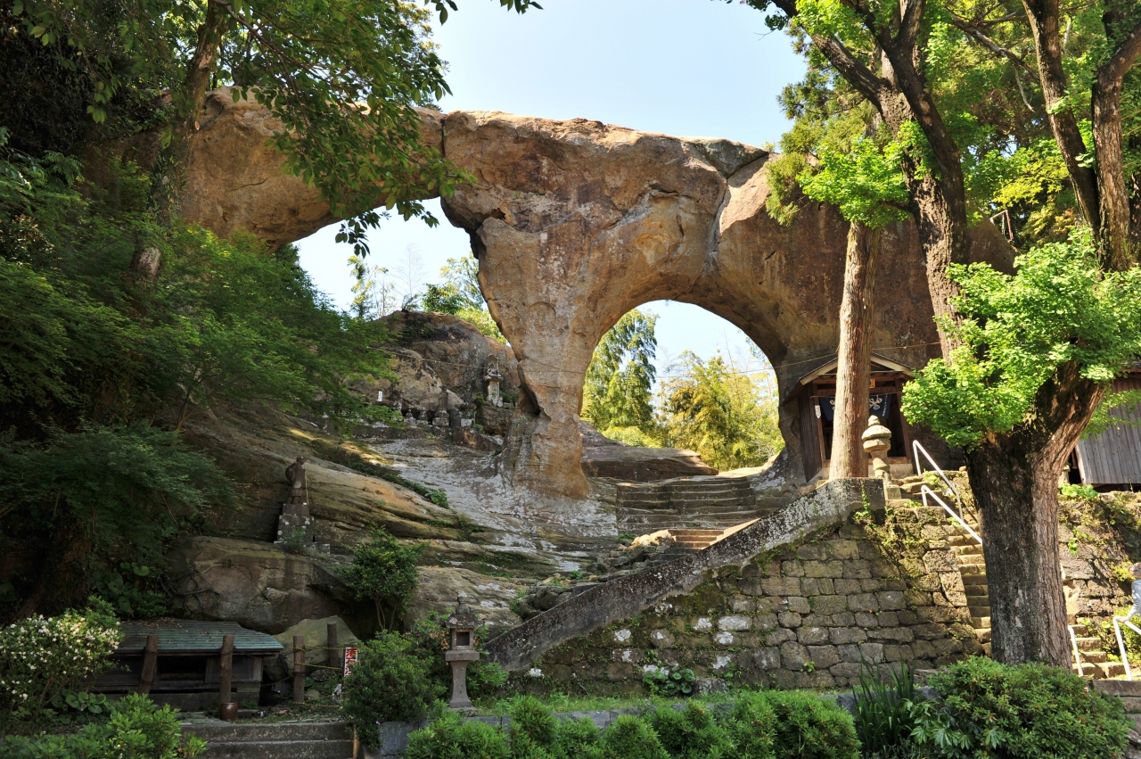 高さ10メートル、横幅20メートルの岩に、直径5メートルと8メートルの大きな穴が開いている奇観だ。その形から眼鏡岩と呼ばれているが、厚みが6メートルもあることから「橋」と呼んでもいいぐらいだ。佐世保にいた大きな鬼が大あくびで両足を伸ばした時に岩を突き破ったという伝説があるが、実際は古代にこの辺りが海だった時代に浸食でできたとみられている。その奇観に驚いた空海が岩面に千手観音像と梵字を刻んだという。刻面の摩耗は進んでいるが、今でも見ることができる。四国八十八カ所を模した霊場のお堂があるほか、周辺は公園として整備されている。幹線道路からの入り口は急こう配で行く末が心配だが、最深部に駐車場が整備されているのでご心配なく。