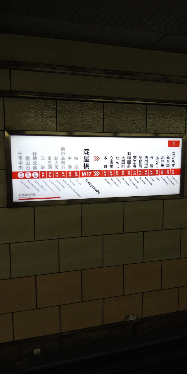 大阪メトロの一番メインの路線です。北の江坂から、南の中百舌鳥までで、途中、新大阪、梅田、心斎橋、難波、天王寺など大阪の主要スポットに停まります。今回は難波駅から、本町駅までを利用しました。土曜日だったので、ぼちぼちすいていましたよ。