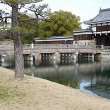 広島城の内堀に架かる木製の橋で、この橋を渡って二の丸へと入ります。お堀の石ともマッチした印象があり、あまり傾斜が無いので、とても渡りやすかったです。また、橋の上から池を眺めている人が結構いたので、なんだろうと覗き込むと、沢山の鯉が泳いでいました。