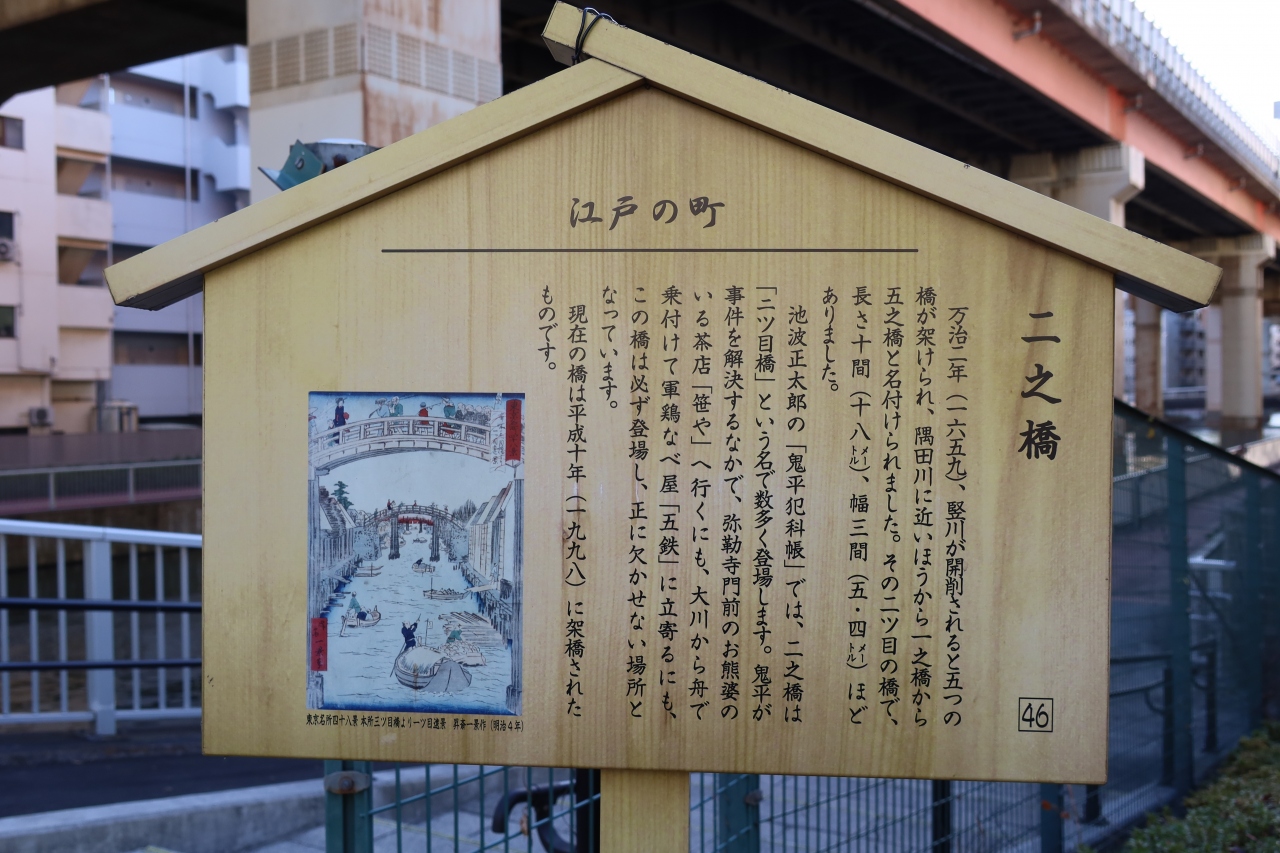 両国の南側を流れる堅川に架かる橋の一つに二之橋があります。1659年に堅川が開削されたときに架けられた5つの橋の内、隅田川から二番目の橋なので二之橋と名付けられました(因みに3つ目は三目通りになってます)。池波正太郎の鬼平犯科帳では二ツ目橋と言う名で何回も描かれている場所。現在の橋は平成に架け替えられた橋で、高速の高架の下となっており当時の趣きがないのが残念。