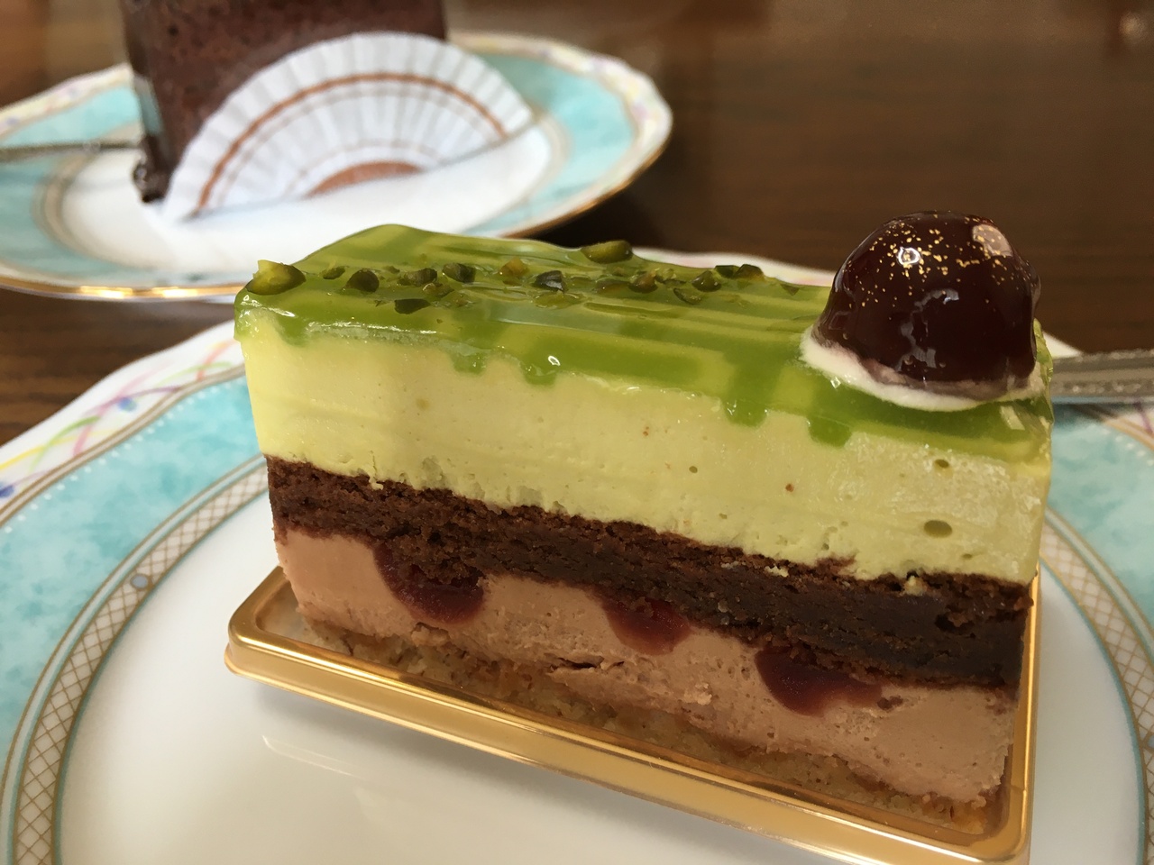 ピスタチオ・ムースがアクセントになっているル・シラキューズは、チェリーに染み込んだブランデーが強烈なパンチを放つ大人用ケーキ。