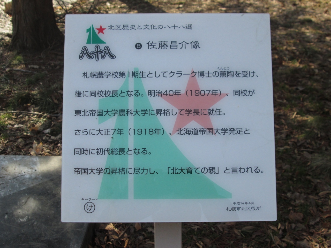 佐藤昌介氏の名は知りませんでしたが隣に説明板があり、北大前身の札幌農学校の1期生でクラーク博士に学び、北海道帝国大学の初代総長となった方でした。