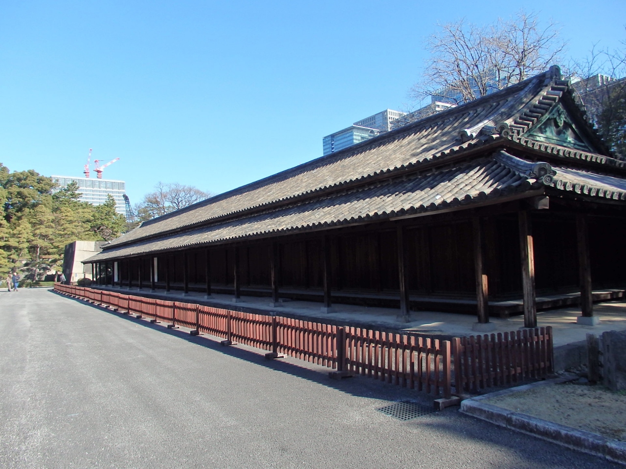 江戸時代からの遺構の一つです。中の門(本丸に入る手前の門)手前にある警備詰め所です。鉄砲百人組とよばれた伊賀組、甲賀組、根来衆等の与力、同心(同心番所より若干上級武士のようです)が配置され、昼夜100人づつが勤務していたので百人番所と呼ばれています。他にある番所より大きな建物です。戦時には諜報活動していた侍も平時になると警備勤めが主な仕事になるのですね